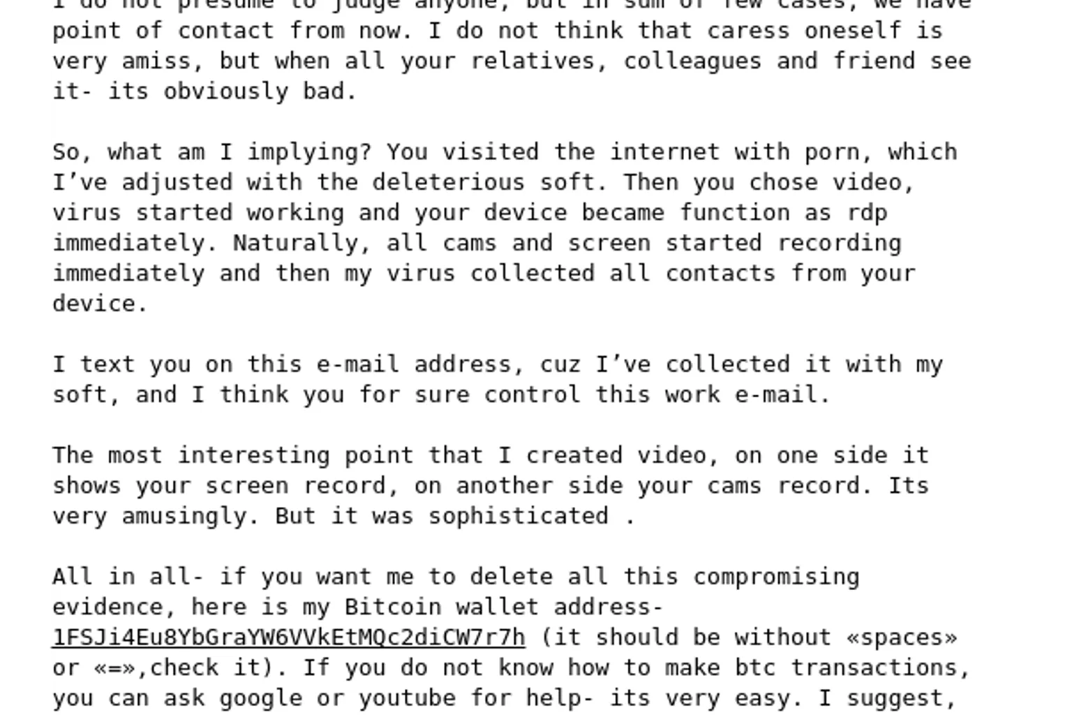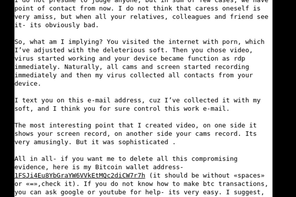 De verspreiding van deze beelden kan de ontvanger van de e-mail voorkomen door binnen een dag een bedrag over te maken op een Bitcoinrekening. Het nummer van deze rekening wordt in de e-mail genoemd. Betaalt de persoon niet, dan stuurt de afperser de beelden naar de contactlijst van de gedupeerde.