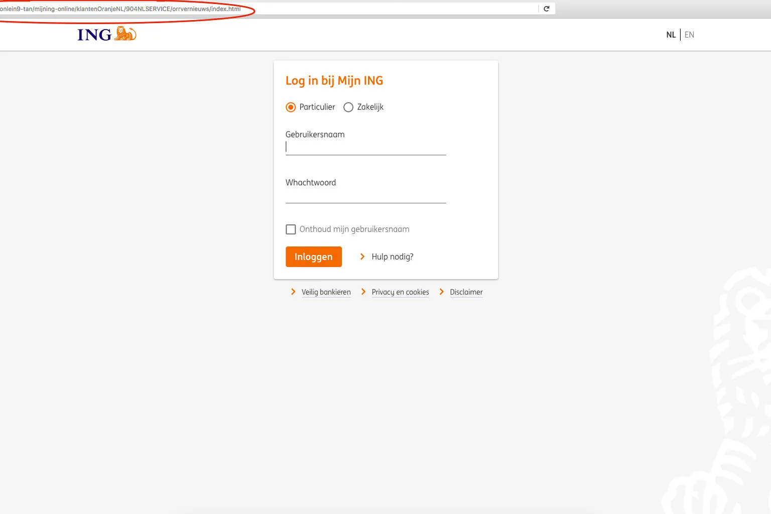 Als je op de button hebt geklikt, kom je op een website terecht die sprekend lijkt op de echte inlogpagina van ING. Je kunt echter aan de URL (in de adresbalk) zien dat het om een valse website gaat (zie afbeelding). De URL komt namelijk niet overeen met die van de echte ING. Log niet in op de phishingsite! Criminelen proberen op deze manier bij jouw bankrekening te komen.