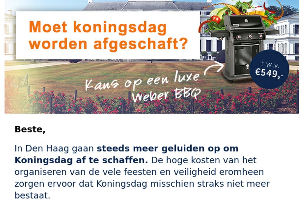 Het lijkt alsof het marketingbureau Circle Leads Ltd. is geïnteresseerd in hoe je denkt over Koningsdag. In sommige berichten staat zelfs dat 'Het Nationale Koningsdag Comité' je mening wil horen. Wie op de link in de e-mail klikt, ziet al snel dat het gaat om een promotioneel kansspel. De prijs is een luxe barbecue.