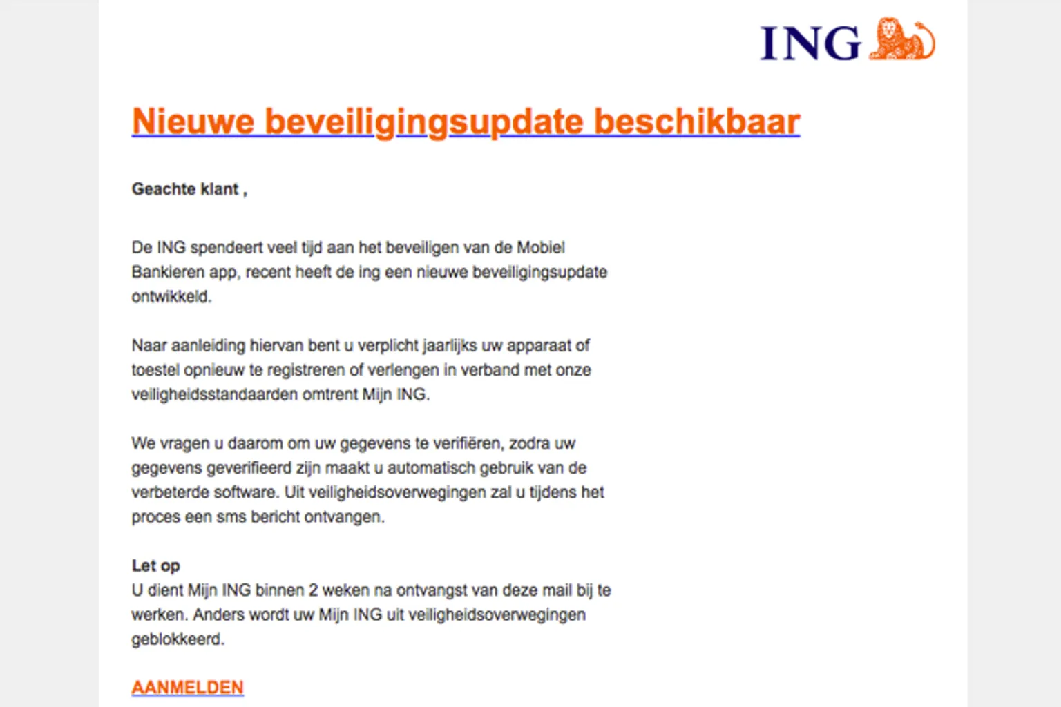 Pas op! Er is een nepmail van 'ING' in omloop. In de e-mail word je een beveiligingsupdate aan geboden. Er wordt gezegd dat je verplicht bent jaarlijks je apparaat opnieuw te registreren. Dit is niet waar. Doe dit dan ook niet.