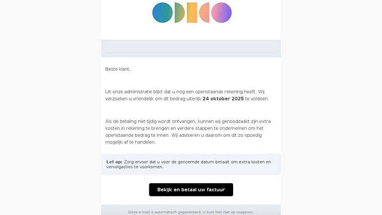 ‘Uit onze administratie blijkt dat u nog een openstaande rekening heeft, betaal dit uiterlijk vandaag’, sturen oplichters namens telecomprovider Odido.