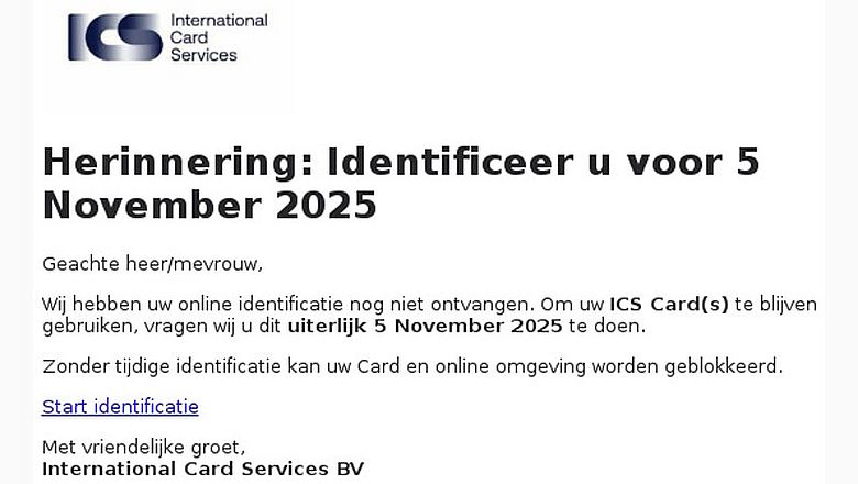 Wil je jouw ICS-creditcard blijven gebruiken, identificeer je dan voor 5 november’, mailen online oplichters uit naam van de creditcardmaatschappij.