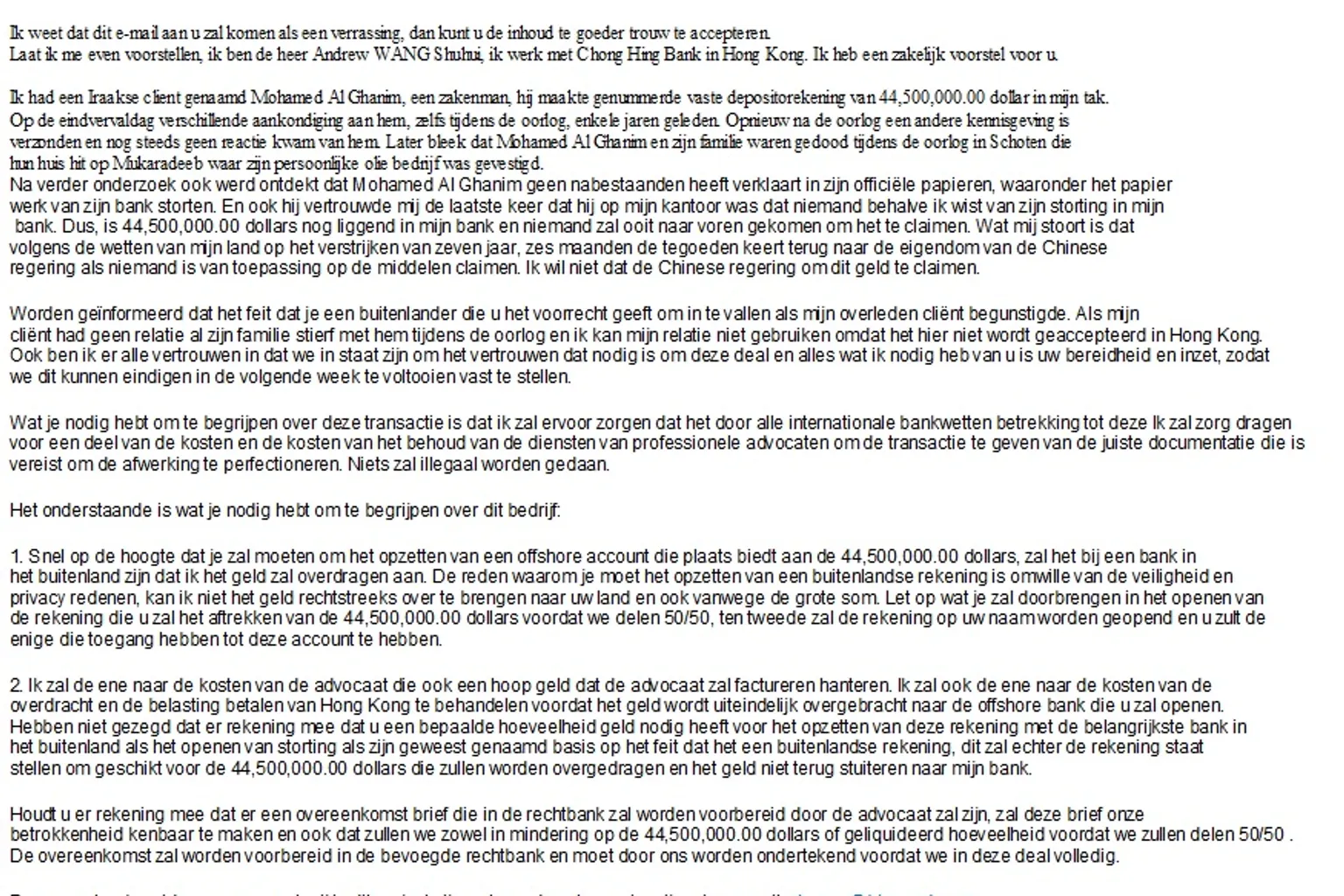 De Chinees vertelt dat een Iraakse klant van hem tijdens de oorlog is overleden. Nu staat er op een rekening nog ruim 44 miljoen dollar. Wanneer dit bedrag na zeven jaar niet door iemand wordt geclaimd, kan de Chinese regering het geld opeisen. Daar zit 'Shuhui' niet op te wachten. Hij zoekt dan ook iemand die kan optreden als begunstigde. 'Alles wat ik nodig heb van u is uw bereidheid en inzet', staat in de mail.