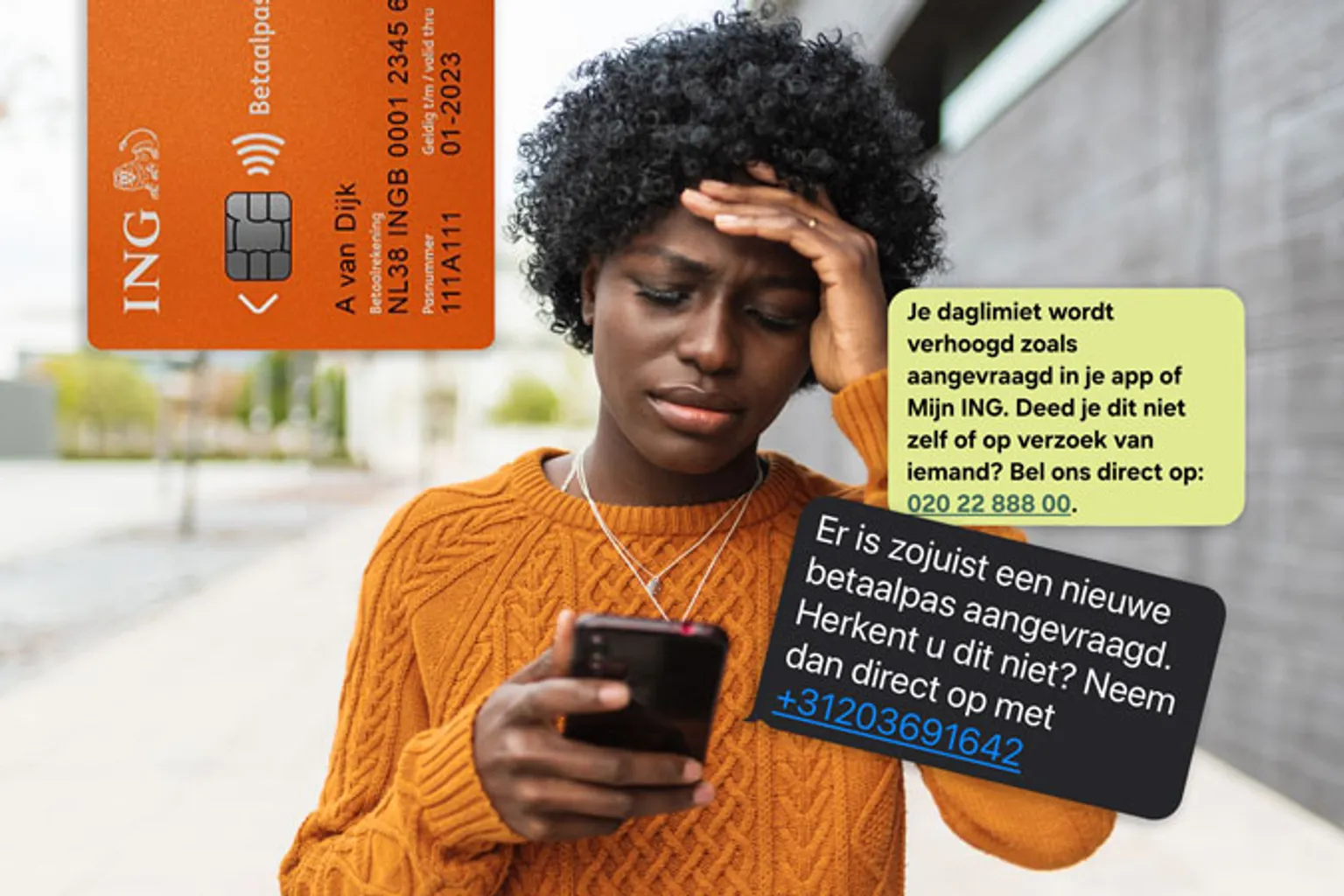 In een echte ING-chat sturen oplichters een sms waarin je een nieuwe betaalpas hebt aangevraagd. Bel niet naar het 06-nummer, want dit nummer is niet van de bank.