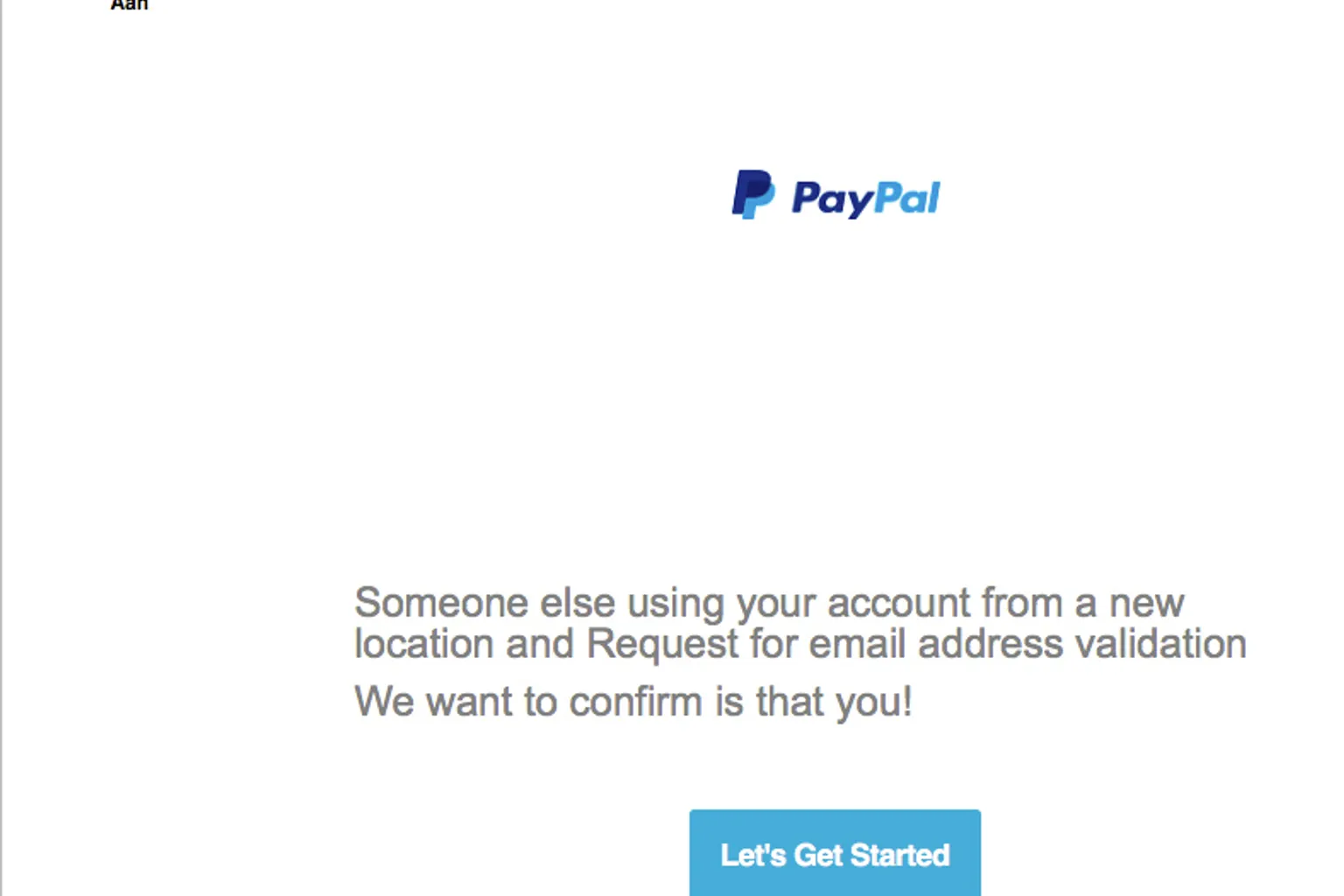 Doordat de onbekende persoon je e-mailadres heeft geprobeerd te valideren, zou PayPal via een bericht willen natrekken of jij dat wel echt bent. Dit kun je zogenaamd aangeven door op de button 'Let's Get Started' te klikken.