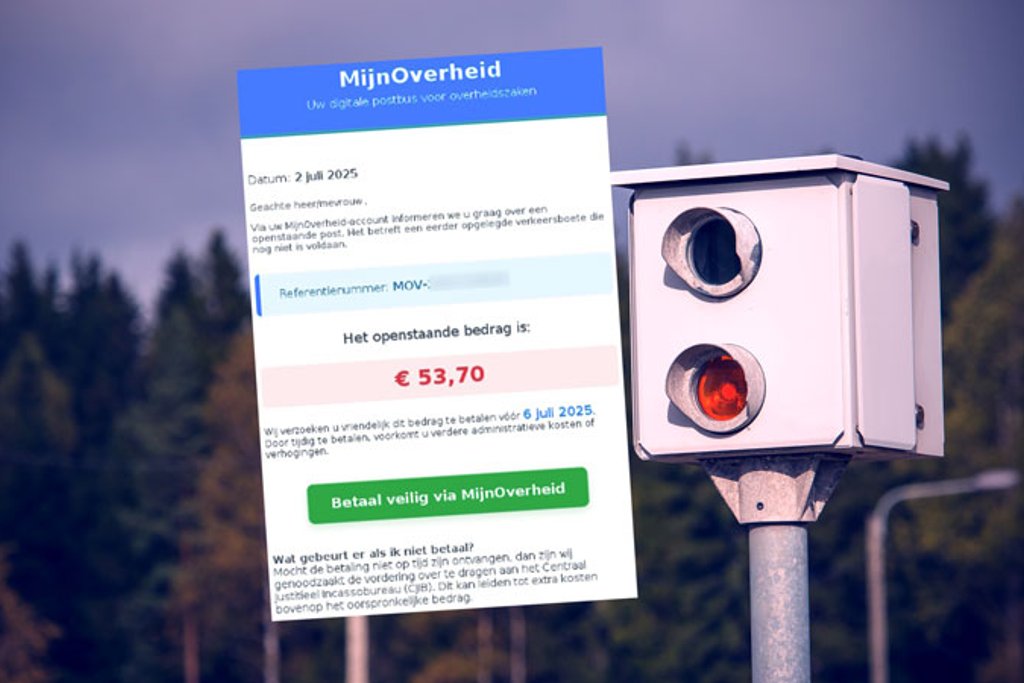 ‘Betaal jouw verkeersboete van €53,70 vóór 6 juli 2025’, schrijven online oplichters namens MijnOverheid