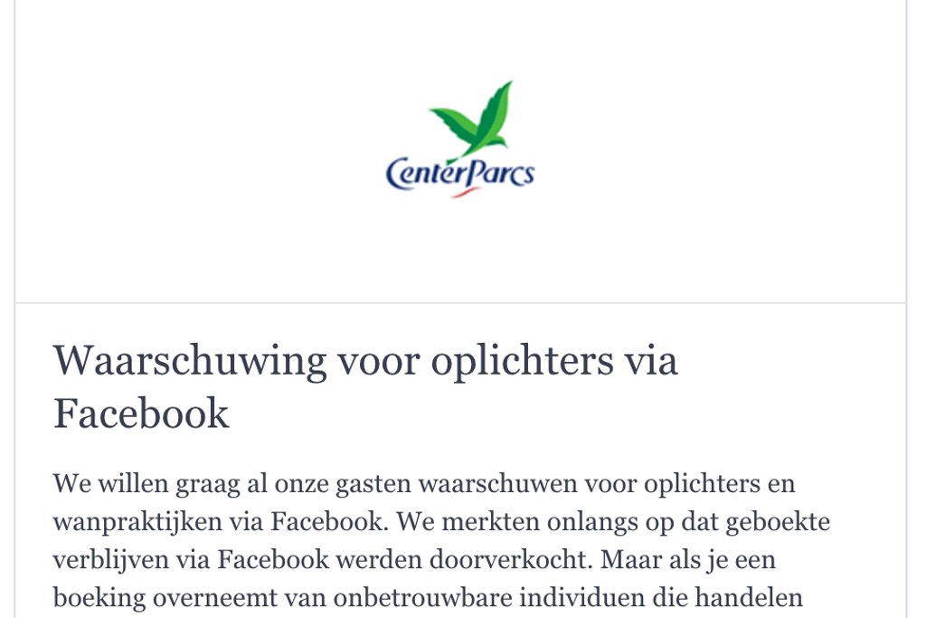 Op de Facebookpagina van Center Parcs Nederland staat de volgende waarschuwing: