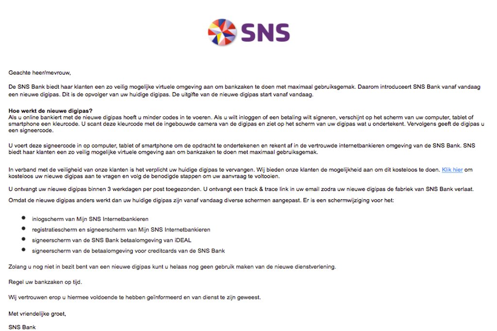 Op de redactie komen dagelijks veel klachten binnen over phishingmails van 'SNS Bank'. Hierin staat dat 'SNS Bank' uit veiligheidsoverwegingen een nieuwe digipas aanbiedt. De nieuwe pas is veiliger en heeft allerlei technische verbeteringen.