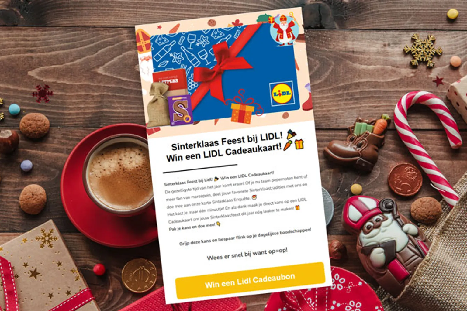"Sinterklaasfeest bij Lidl!", begint het nepbericht. Deel jouw Sinterklaastradities met Lidl via de enquête en maak kans op een Lidl-cadeaukaart.