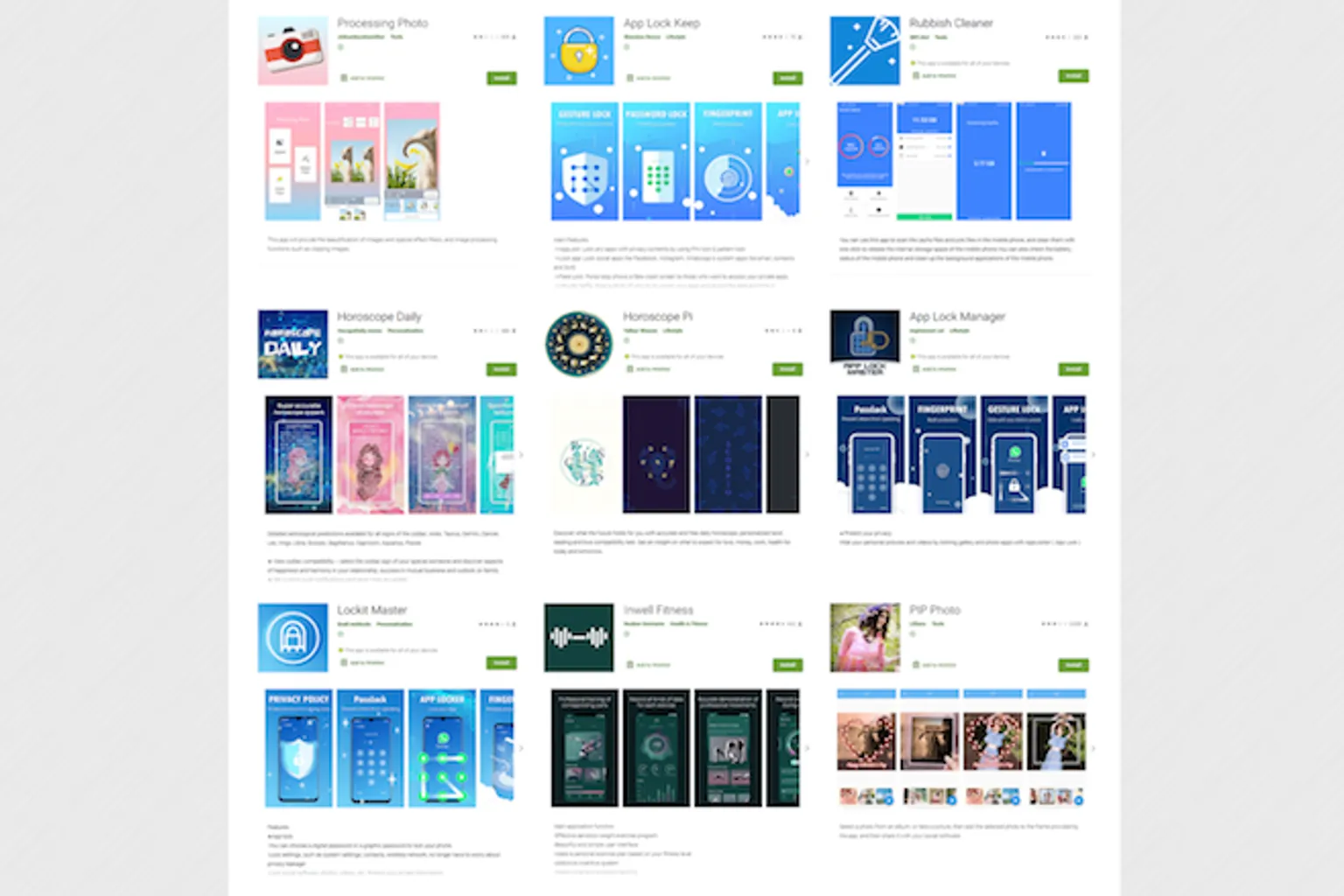 De app PIP Photo is qua aantal downloads de grootste: zeker 5 miljoen van de 5,8 miljoen downloads komt voor rekening van deze app. Om het je wat makkelijker te maken, staan hieronder close-ups van de negen apps zoals ze in de Google Play Store stonden: zo kun je in één oogopslag zien of een van deze apps je wellicht bekend voorkomt.