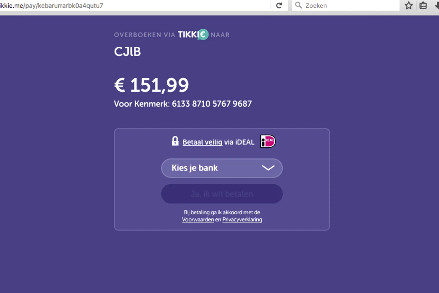 In de e-mail staat dat je geld moet overmaken via IDEAL. Dit doe je door op een link in het bericht te klikken. Opvallend is dat de link uitkomt op Tikkie. Dit is een betaaldienst van de ABN AMRO via WhatsApp. Maar wanneer je de link e-mailt, kun je de betaalverzoeken ook buiten WhatsApp verspreiden.