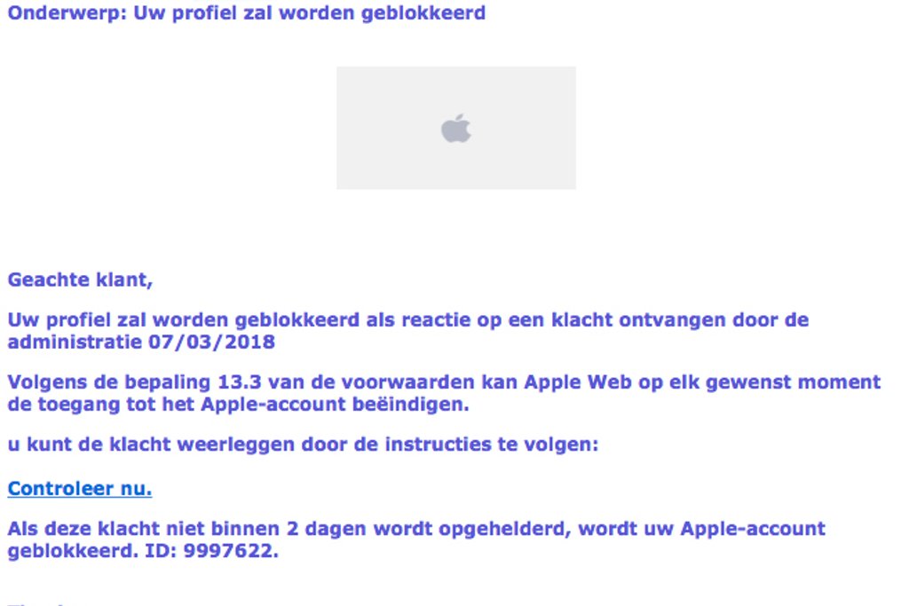 Heb je een e-mail ontvangen met de boodschap dat jouw Apple-account is geblokkeerd vanwege een klacht die over je is ingediend? Pas dan op! Je hebt een phishingmail in je mailbox.