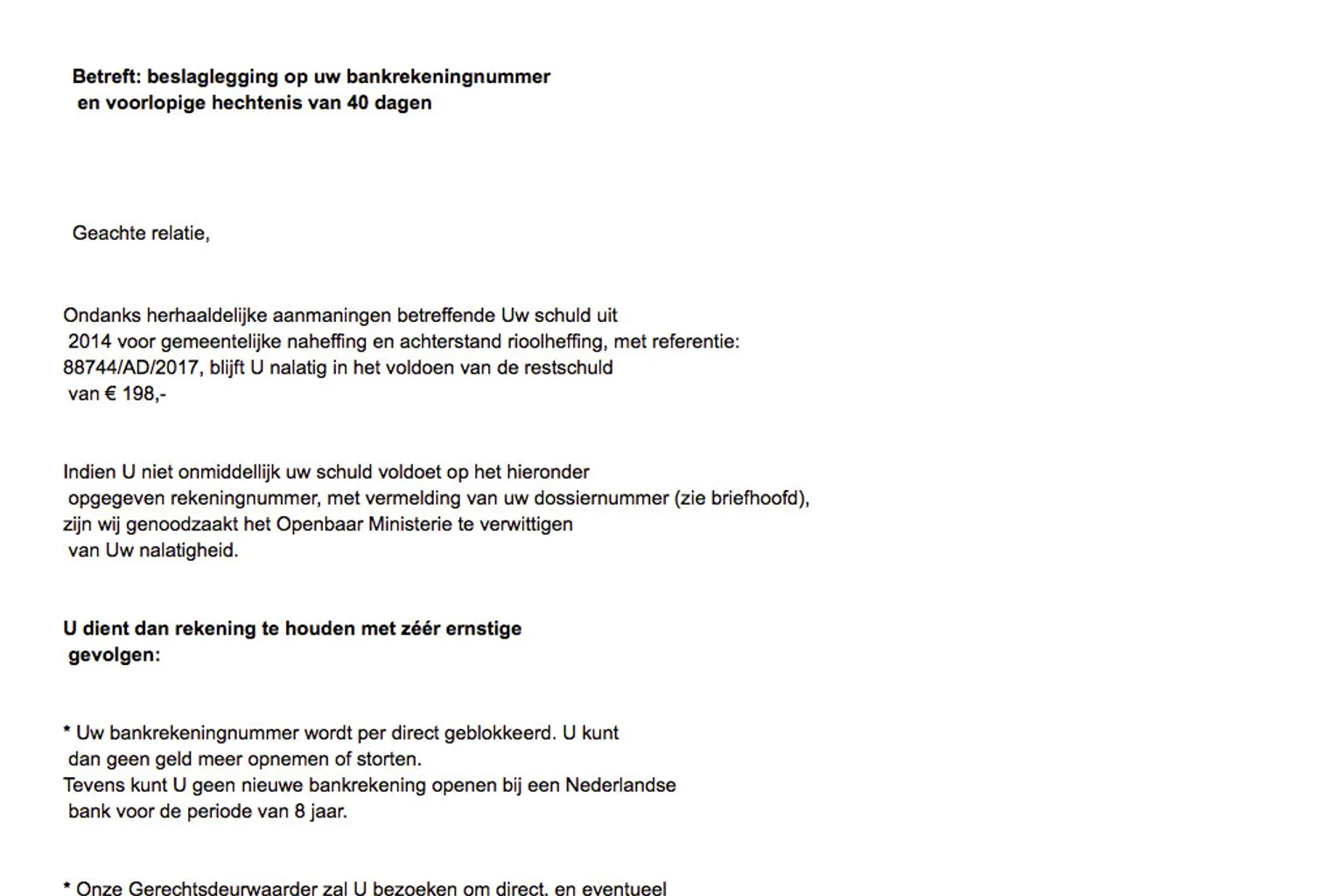 In de e-mail staat dat je rekening moet houden met zeer ernstige gevolgen. Zo zou je bankrekening per direct geblokkeerd worden. Ook wordt gedreigd met een gerechtsdeurwaarder en zou je aangehouden worden als je niet betaalt.