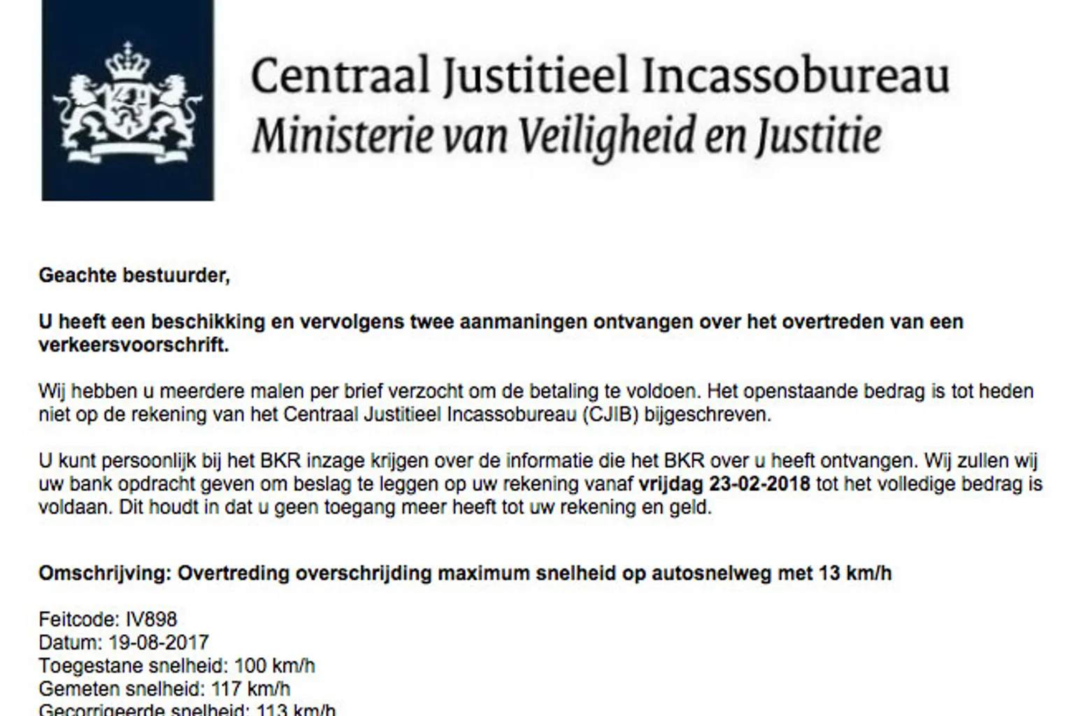 De e-mail bevat een derde aanmaning over een verkeersboete die je al eerder ontvangen zou hebben. Je hebt de boete gekregen omdat je te hard zou hebben gereden op de snelweg. Voor aanstaande vrijdag dien je de boete betaald te hebben. Trap hier niet in! Je hebt met een valse e-mail te maken.