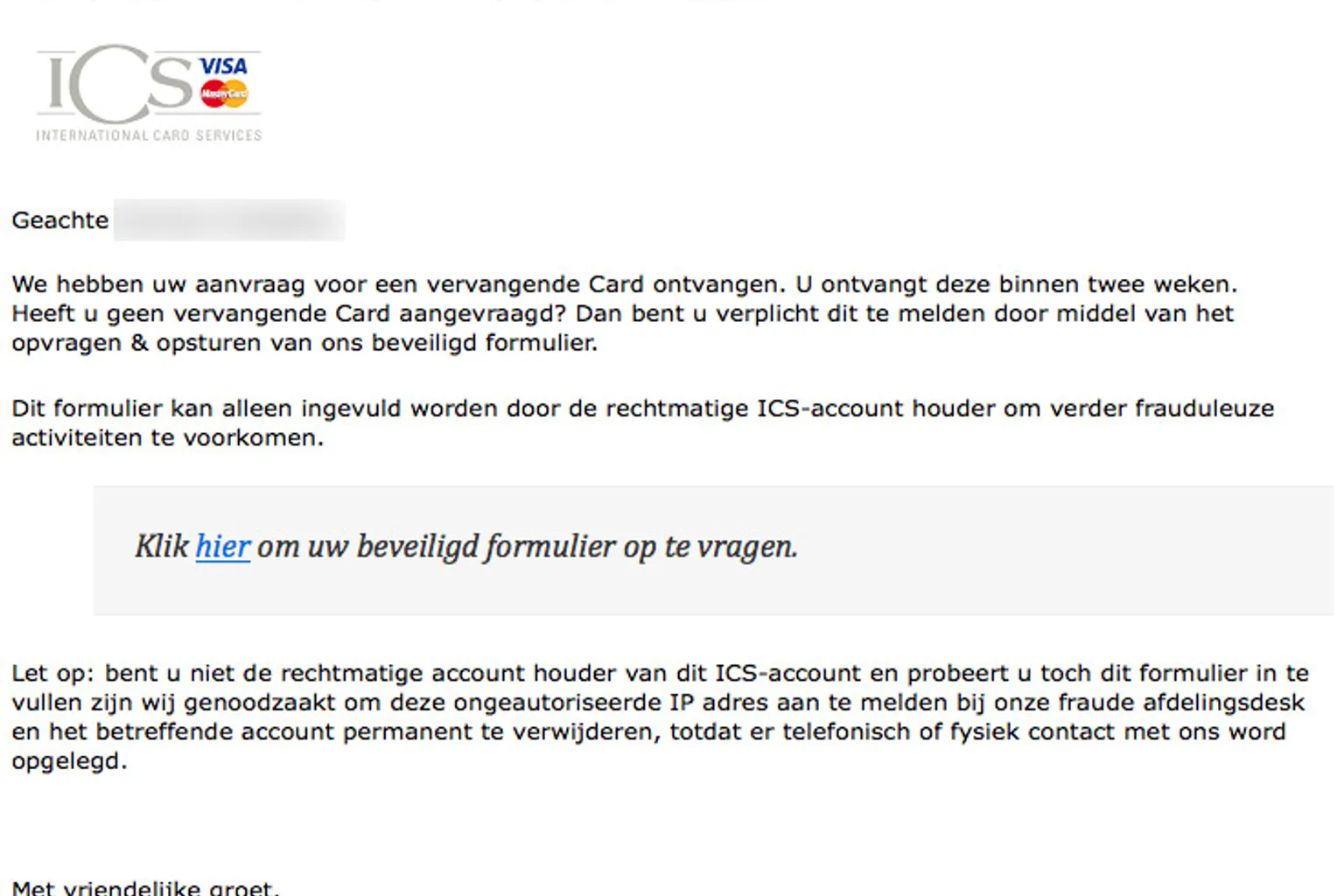 In de e-mail, zogenaamd van ICS, staat dat de creditcardmaatschappij een aanvraag voor een vervangende card heeft ontvangen. Indien je deze aanvraag niet hebt gedaan, moet je dit zogenaamd melden via een 'beveiligd formulier'. Let op! Alles wat je via dit formulier verstuurt, valt in handen van kwaadwillenden. Zij kunnen vervolgens misbruik kunnen maken van jouw creditcard.