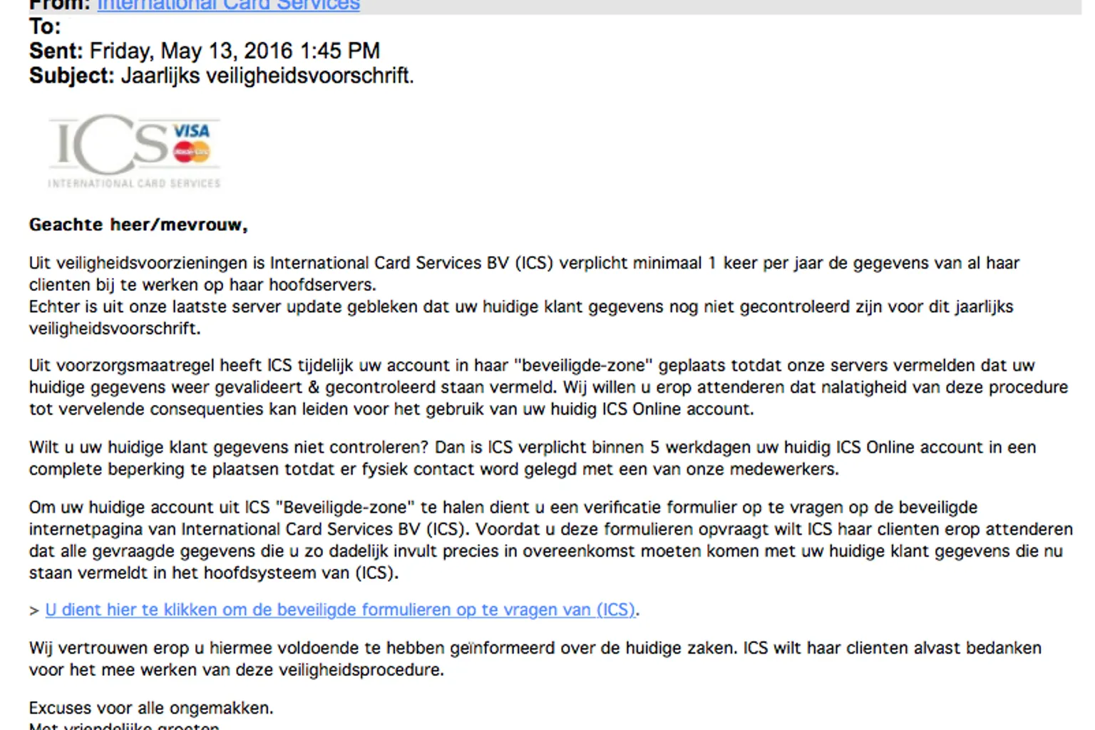 In de e-mail staat dat je uit veiligheidsredenen je gegevens moet bijwerken. Doe je dit niet, dan kan dit leiden tot 'vervelende consequenties voor het gebrek van je ICS online account'. Trap er niet in.