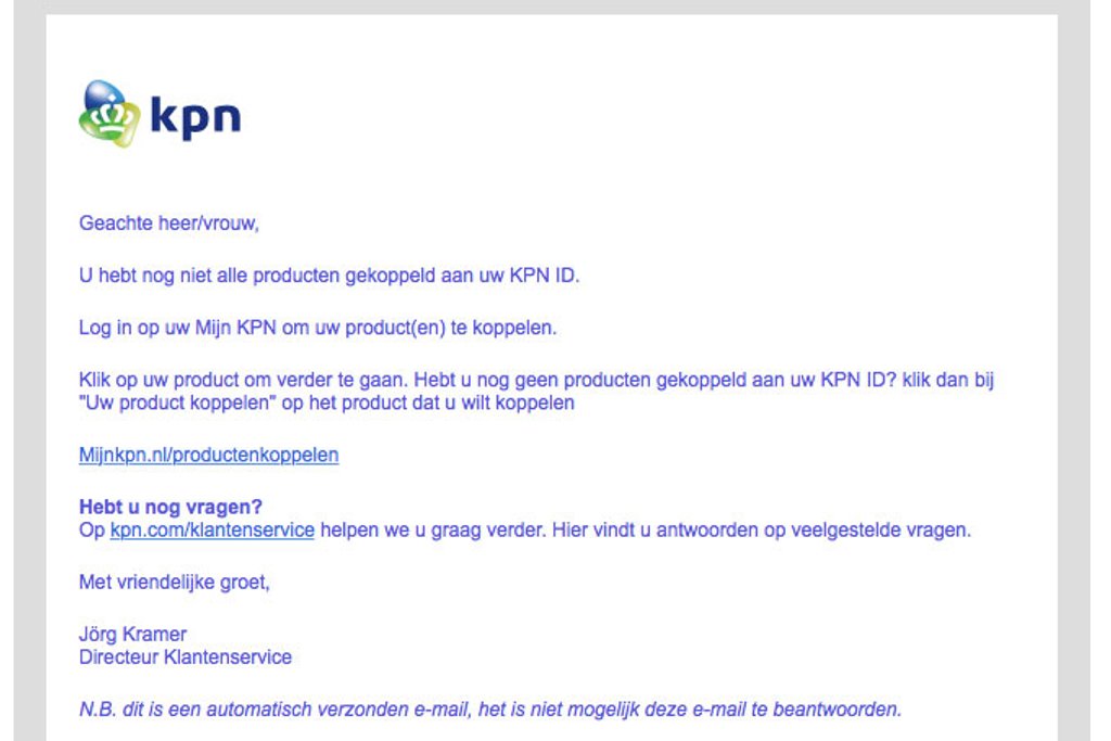 Er is een e-mail in omloop uit naam van KPN waarin staat dat je nog niet alle producten aan je KPN ID hebt gekoppeld. Trap er niet in! Het is een phishingmail.
