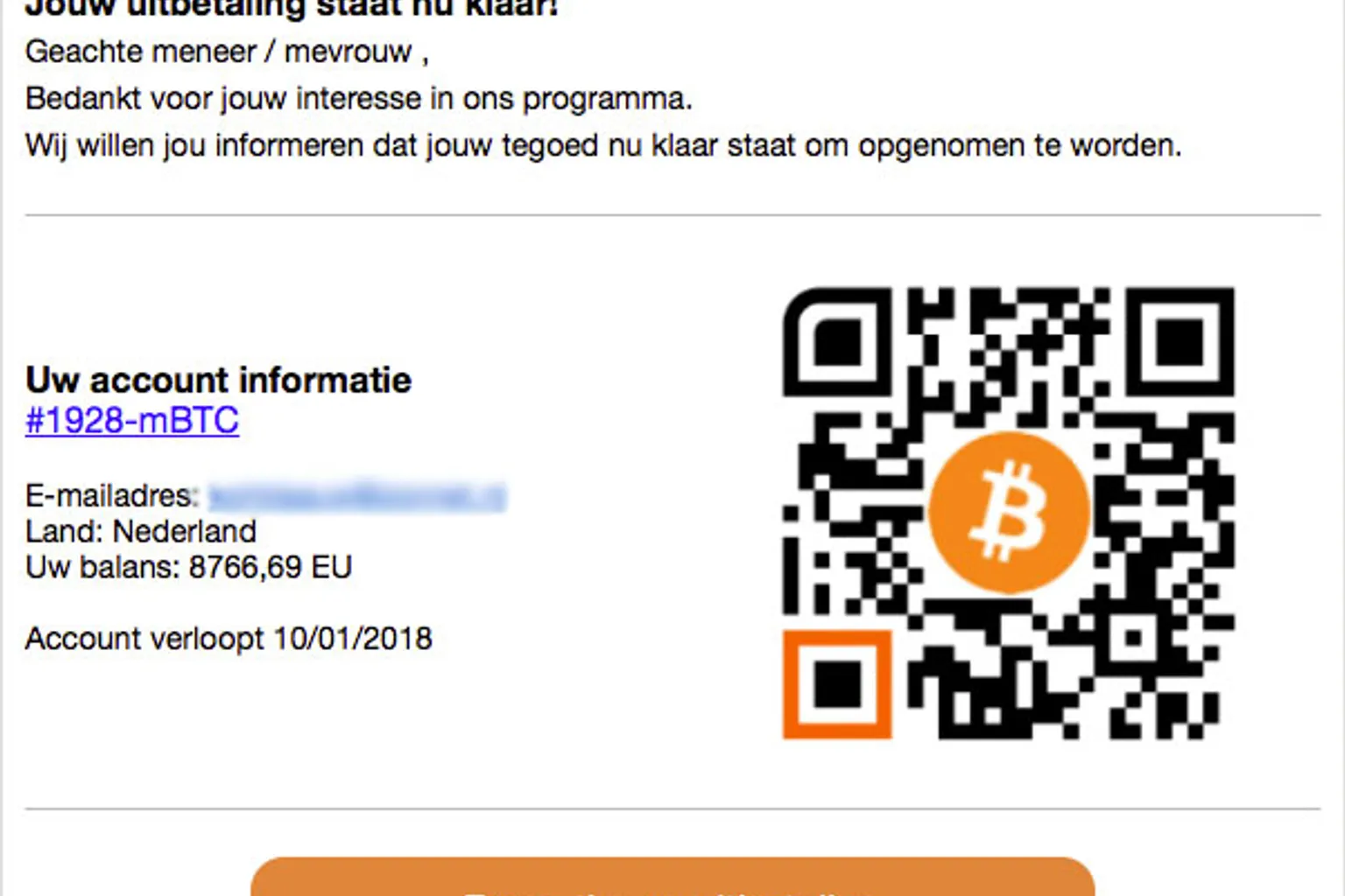 E-mail over uitbetaling in bitcoins blijft in omloop