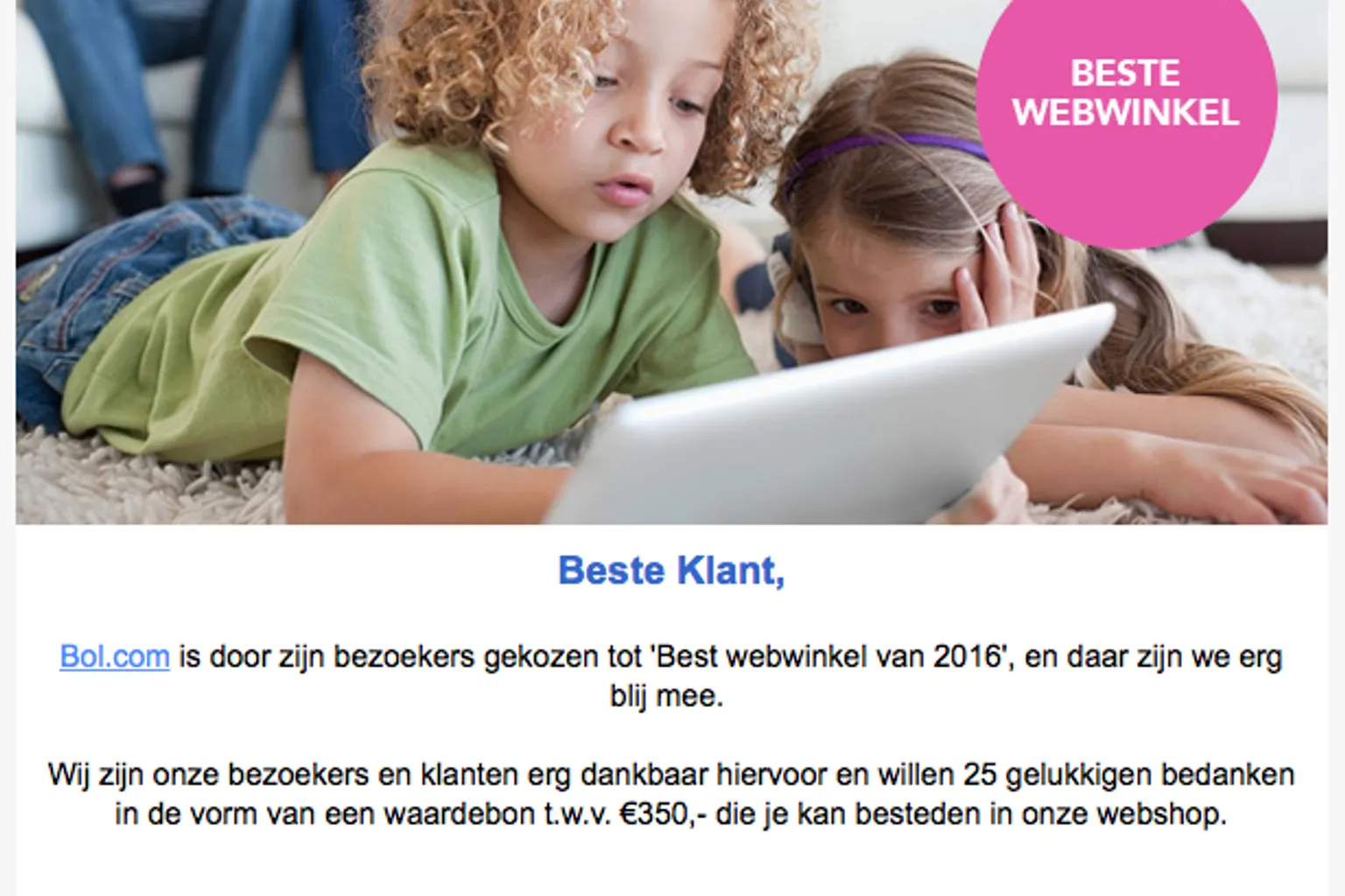 Internetcriminelen misbruiken de naam van Bol.com. Het lijkt alsof je iets kan winnen, maar wanneer je de quizvragen hebt beantwoord moet je je telefoonnummer invullen. Om nog kans te maken op de zogenaamde prijs moet je vervolgens bellen naar een duur telefoonnummer en nog meer quizvragen beantwoorden. Het kan ook zijn dat, wanneer je eenmaal je telefoonnummer hebt achtergelaten, je vervolgens vast zit aan een duur sms-abonnement. Laat je gegevens dus niet achter en verwijder de e-mail!