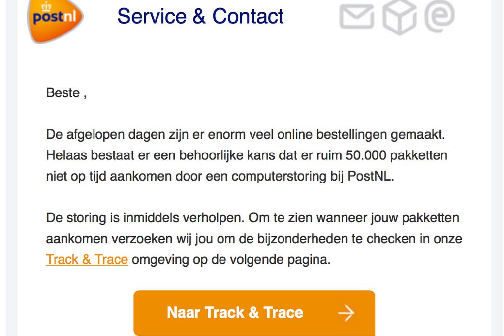 Opgelicht?! ontvangt meldingen over een e-mail die zogenaamd van PostNL afkomstig is. Hierin staat dat er 50.000 pakketten niet op tijd aankomen door een computerstoring in het bedrijf. Trap er niet in!