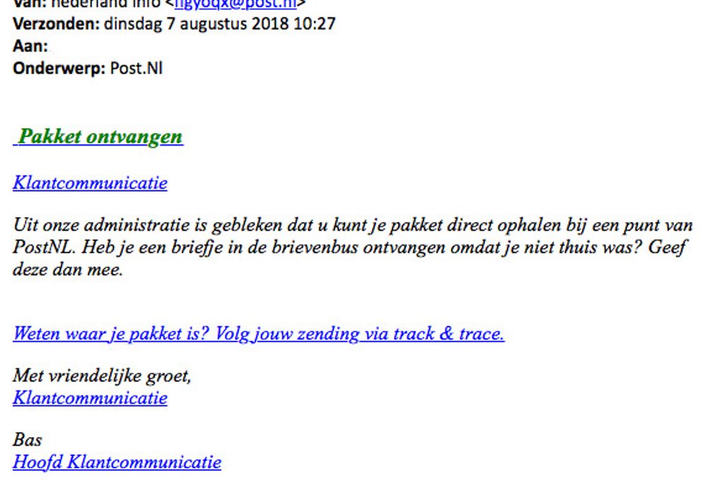 Let op! In een e-mail over een ontvangen pakket van PostNL zit malware verstopt. Klik niet op de 'track & trace' link in dit bericht.