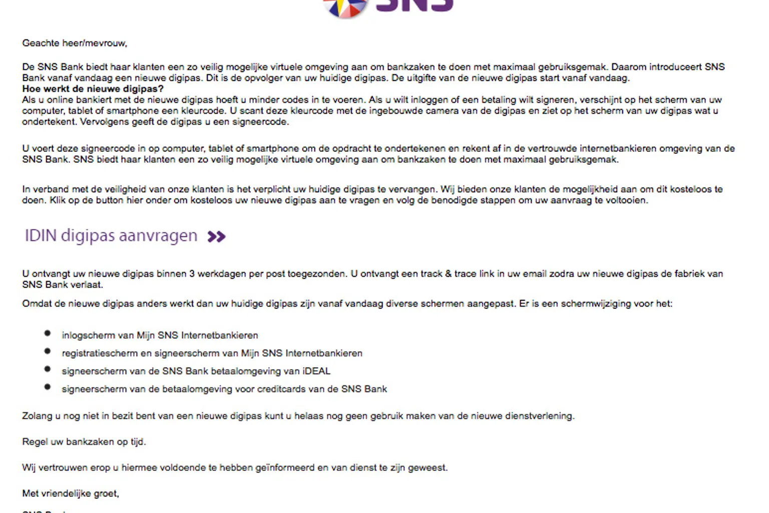 Volgens de e-mail introduceert de bank een nieuwe, veiligere digipas. Klanten zouden de huidige pas verplicht moeten vervangen. Zij worden verzocht op een button in het bericht te klikken en een aantal stappen te doorlopen om kosteloos een nieuwe pas aan te vragen.
