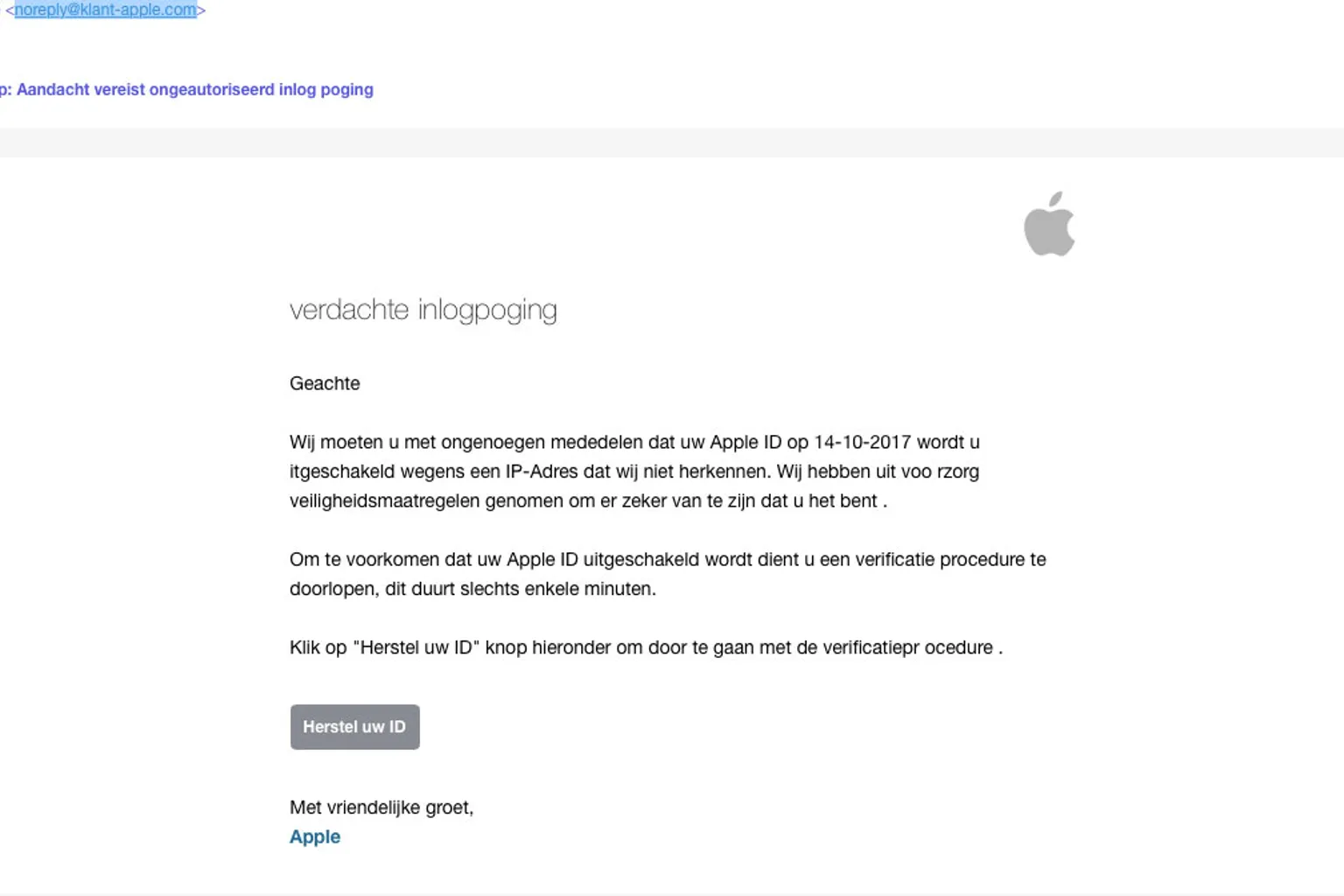 Hoewel de lay-out van het bericht niet van echt te onderscheiden is, wordt bij het lezen van de mail direct duidelijk dat het een valse e-mail betreft. Het bericht staat vol met slordige taalfouten. Bovendien blijkt dat het e-mailadres van de afzender niet van Apple is. De mail komt van criminelen die jouw inloggegevens in handen proberen te krijgen.