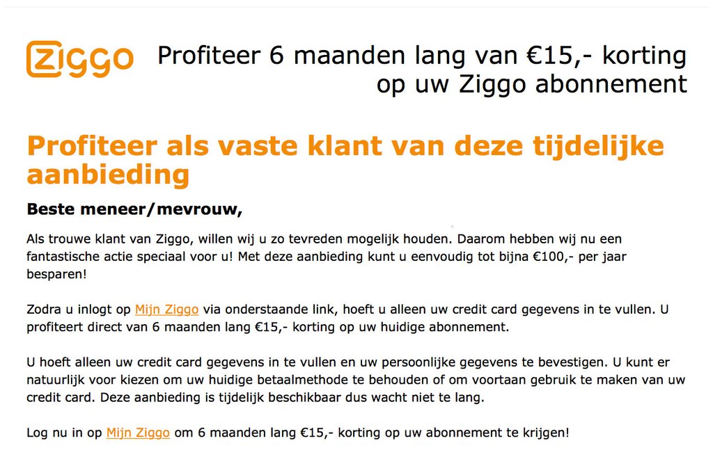 In een e-mail van 'Ziggo' die nu rondgaat staat dat je van een mooie aanbieding kunt profiteren. Aangezien het bedrijf je al klant waardeert, zou je zes maanden lang €15,- korting krijgen. Dit klinkt misschien als een aantrekkelijke aanbieding, trap er niet in!
