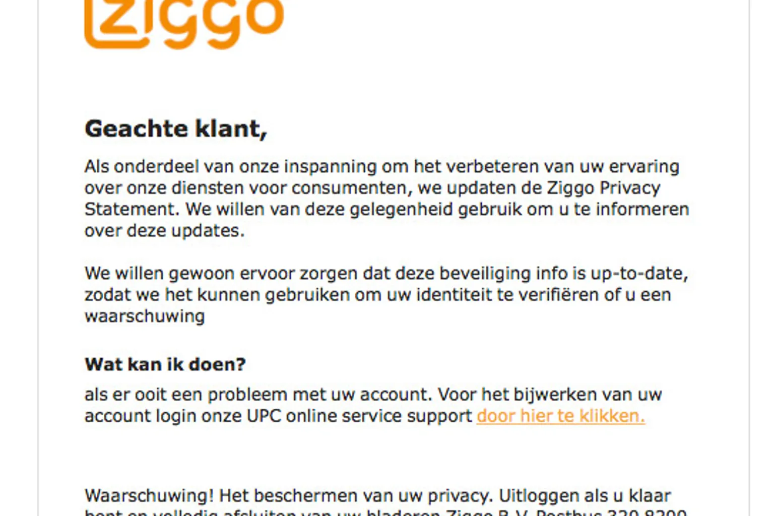 In de e-mail, zogenaamd van Ziggo, staat in uiterst slecht Nederlands geschreven dat het bedrijf de Ziggo Privacy Statement updatet. Daarom dien je je gegevens te verifiëren via een link in het bericht. Ga hier niet op in!