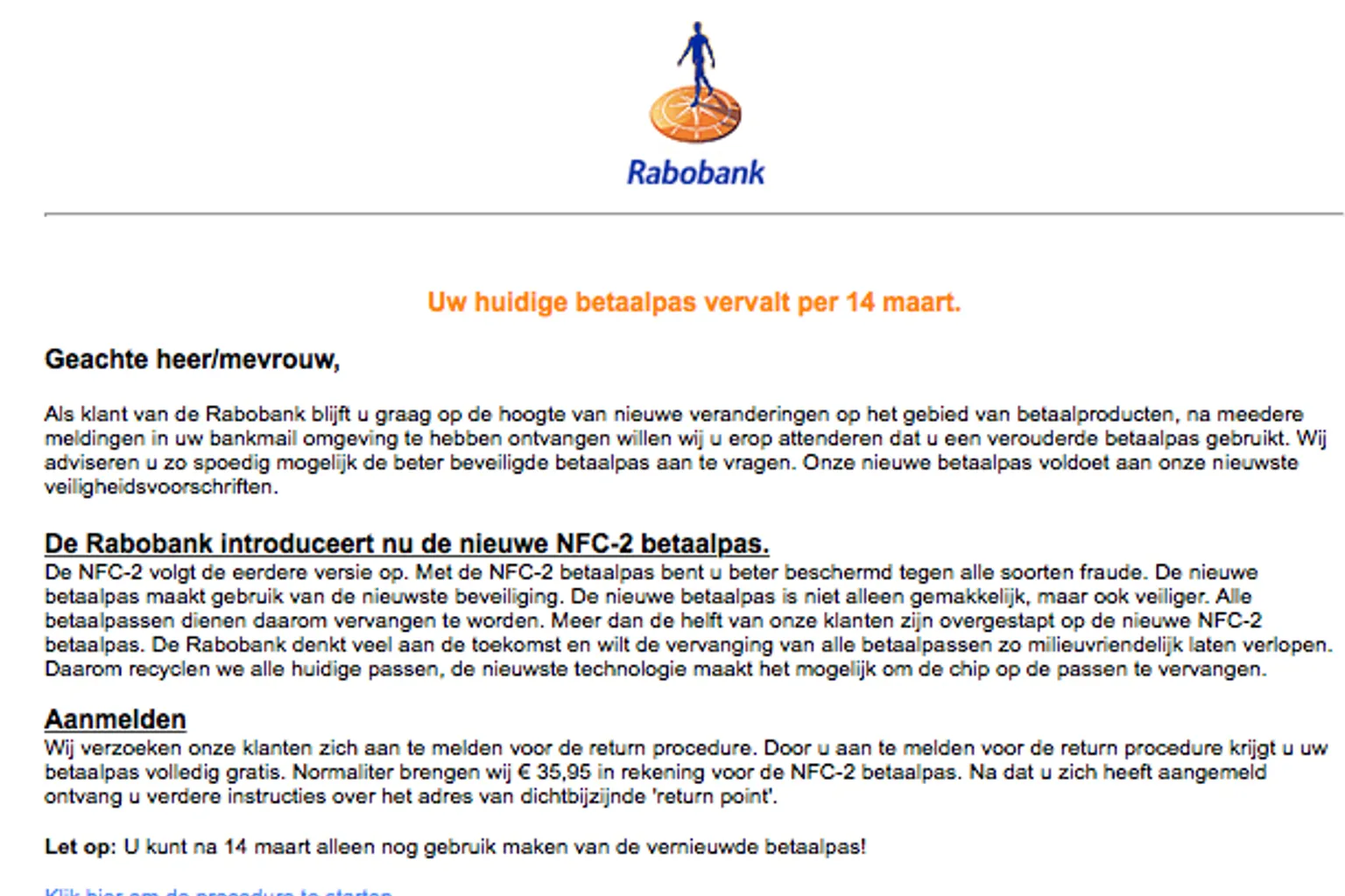 Krijg je een e-mail van de 'Rabobank' over een nieuwe betaalpas? Verwijder deze dan! Het gaat hier om phishing.