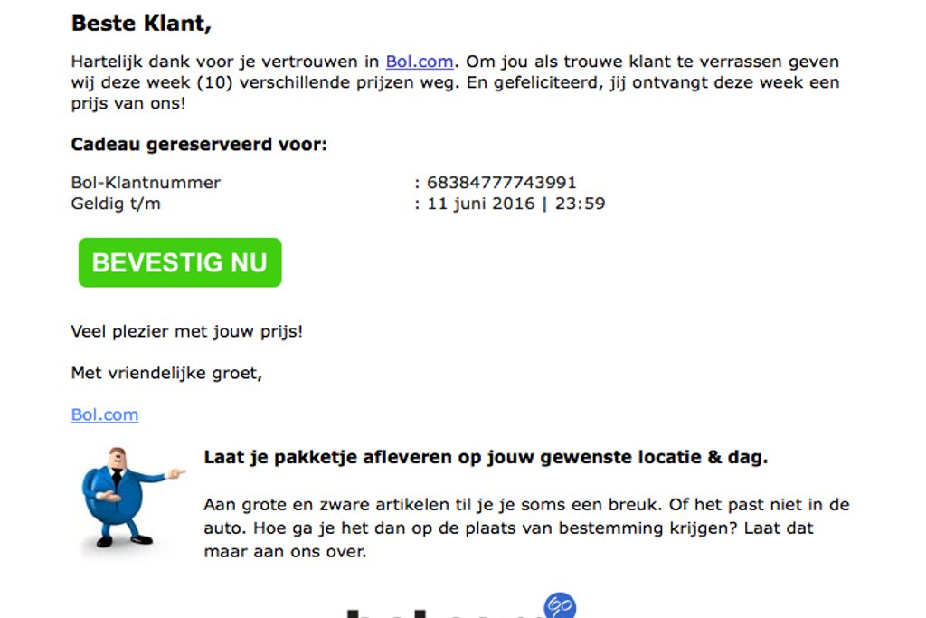 Oplichters misbruiken de naam van Bol.com. Ze sturen e-mails die afkomstig lijken van de webwinkel. In het bericht staat dat je een prijs gewonnen hebt, maar dit is niet waar. Als je op de link 'bevestig nu' klikt, kom je terecht op een nagemaakte website, die niets met Bol.com te maken heeft. Vervolgens moet je een aantal vragen beantwoorden en je e-mailadres invullen.