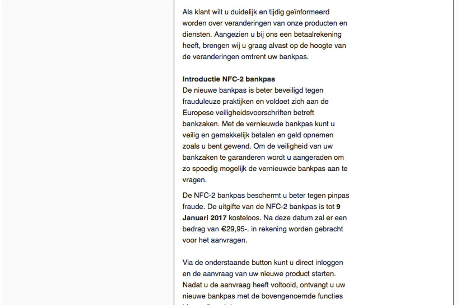 Volgens de e-mail is de vernieuwde betaalpas beter beveiligd tegen frauduleuze praktijken en voldoet deze aan de Europese veiligheidsvoorschriften. Je dient zo spoedig mogelijke de nieuwe pas aan te vragen, zo schrijven criminelen.