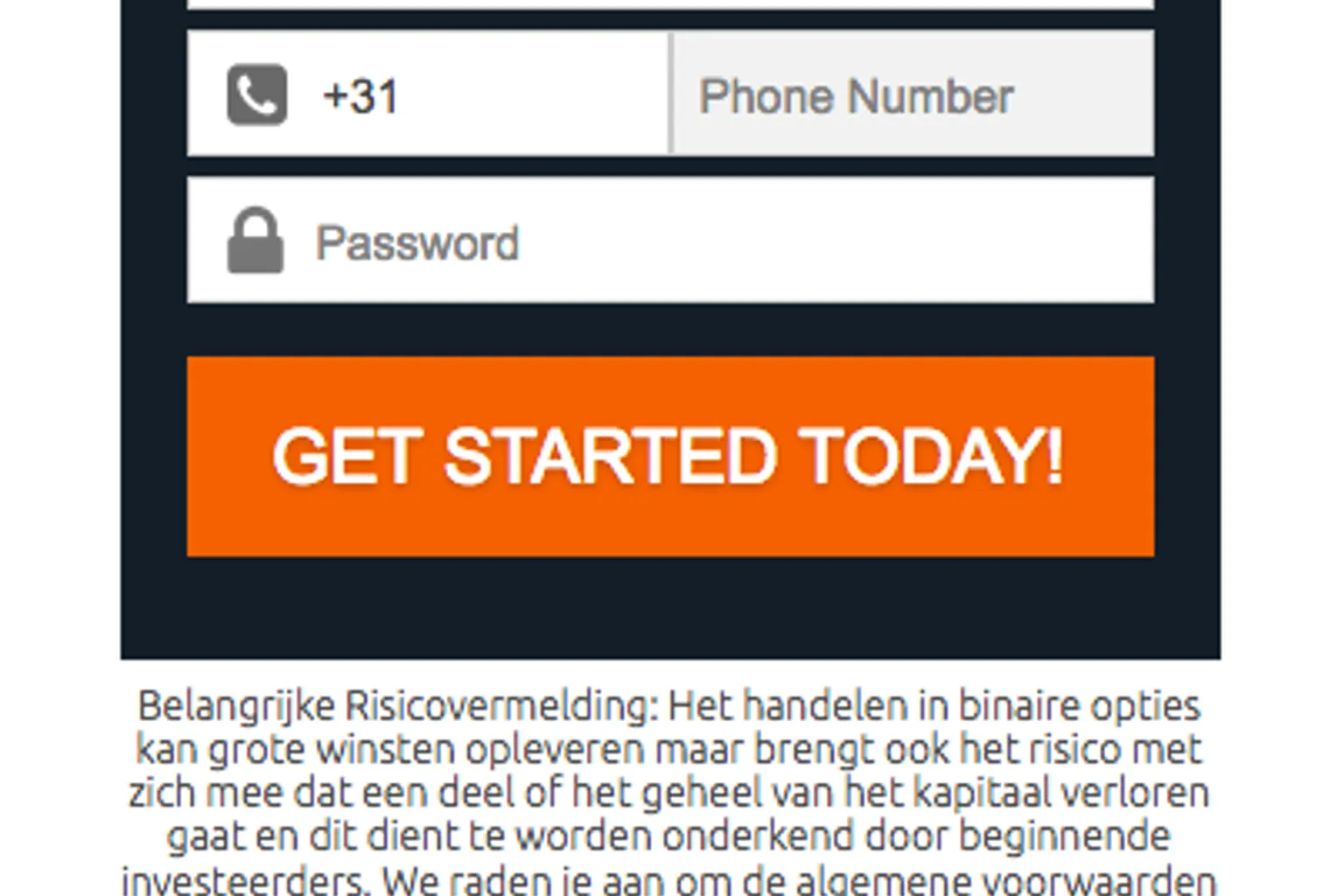 Maar zodra je op de link klikt, kom je erachter dat je helemaal geen baan aangeboden krijgt. De link leidt naar een website over The Bitcoin Code, met deze 'software' zou je heel gemakkelijk veel geld kunnen verdienen. Zodra je je e-mailadres hebt ingevuld, verschijnt een nieuw scherm waar je ook je naam en telefoonnummer in moet vullen. Helemaal onderaan de pagina verschijnt een waarschuwing over handel in binaire opties.