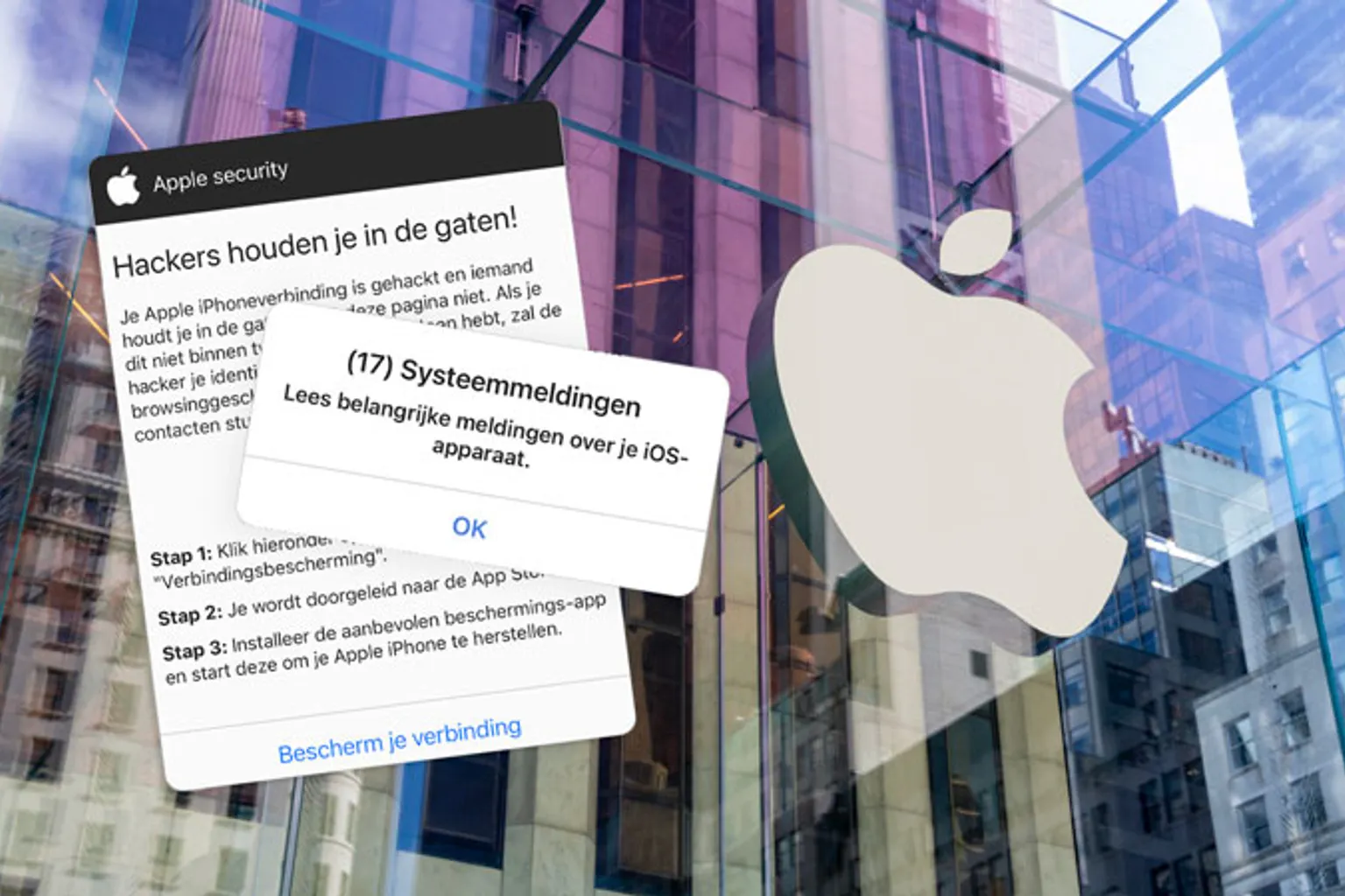 Het werkt zo: eerst verschijnt er een pop-up op je scherm waarin wordt gemeld dat er 17 systeemmeldingen zijn gevonden op je apparaat. Zodra je op 'OK' drukt, krijg je een bericht te zien waarin staat dat je iPhone verbinding is gehackt en hackers je in de gaten houden, meldt PCrisk.