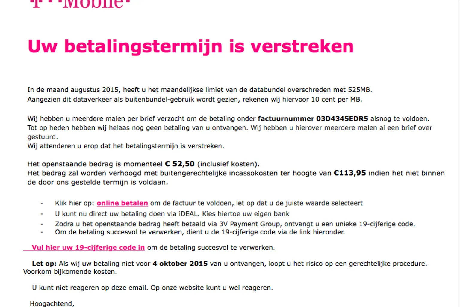 De afzender van de mails verschilt, de inhoud is identiek. De ontvanger zou in augustus de databundel met 525MB hebben overschreden. Hiervoor moet een bedrag van € 52,50 betaald worden via een 3V-kaart. Trap hier niet in!