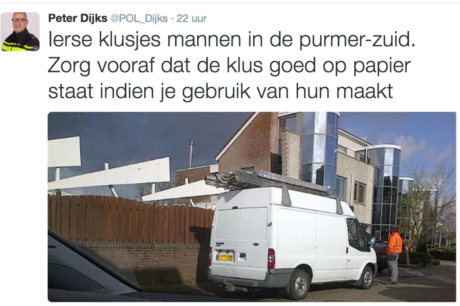Nu het voorjaar begint duiken overal in het land Ierse klusjesmannen op. Ook in Purmerend zijn ze gesignaleerd. Een Purmerendse wijkagent waarschuwt via Twitter voor hun praktijken en toont een foto van het busje waarin de mannen zich verplaatsen.