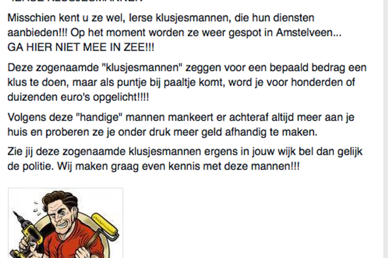 "Misschien kent u ze wel, Ierse klusjesmannen, die hun diensten aanbieden!!! Op het moment worden ze weer gespot in Amstelveen...