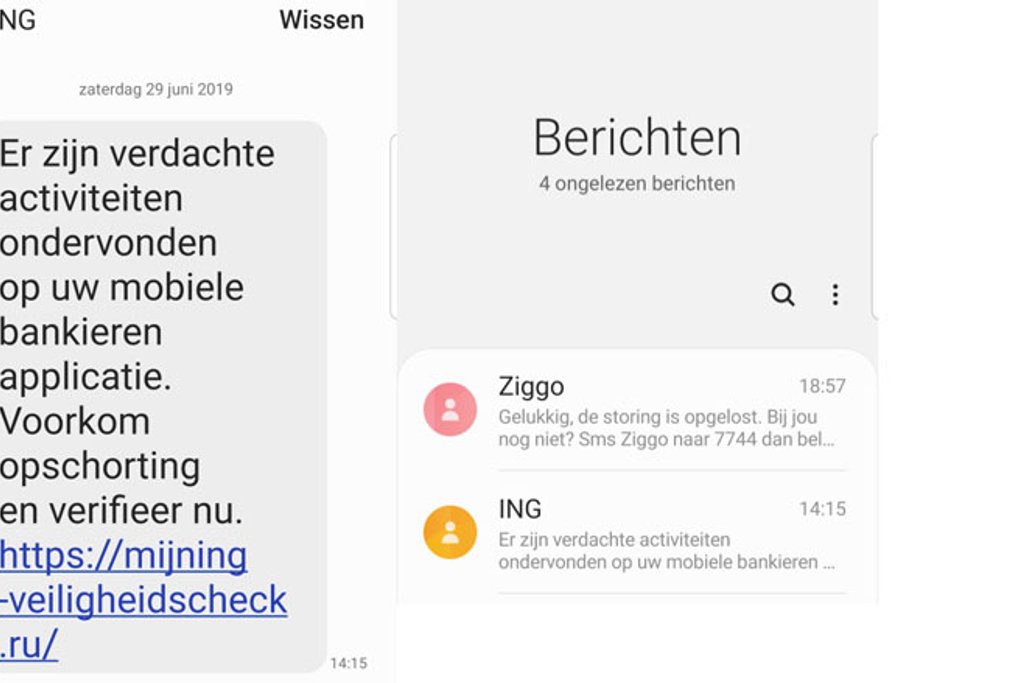 'Er zijn verdachte activiteiten ondervonden op uw mobiele bankieren applicatie'. Zo begint de nep-sms die verstuurd is uit naam van ING. Heb je deze sms gekregen klik dan niet op de link maar verwijder de sms meteen.