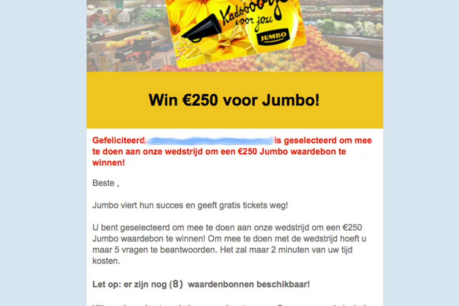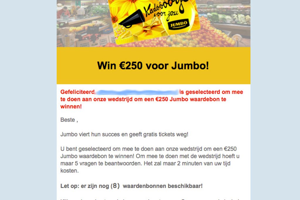 Uit naam van Jumbo worden mails verstuurd, waarin wordt aangegeven dat je mee kan doen aan een wedstrijd. Met deze wedstrijd zou je een waardebon van 250 euro kunnen winnen. Dit is echter een misleidende winactie, doe hier niet aan mee!