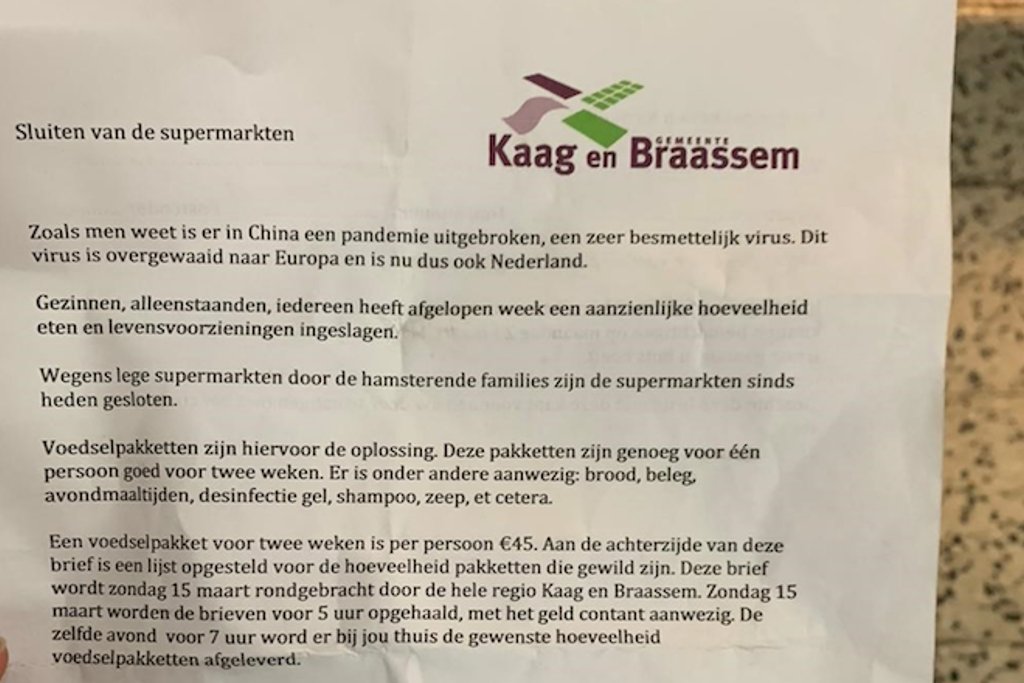 Deze brieven doken op in de Zuid-Hollandse gemeente Kaag en Braassem, maar mogelijk proberen oplichters in andere gemeenten op vergelijkbare wijze hun slag te slaan. Zeker ouderen die vanwege een kwetsbare gezondheid mogelijk aan huis gekluisterd zijn, zullen wellicht denken dat dit een adequate oplossing is voor dreigende tekorten in de voorraadkast.