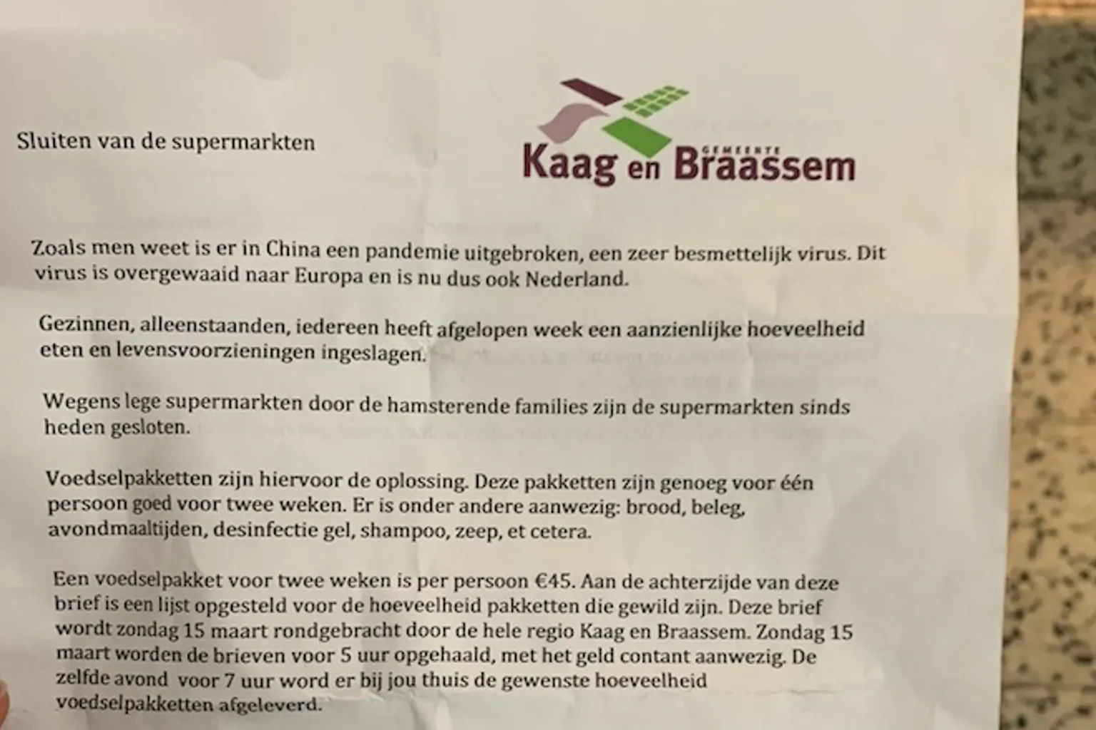 Op Twitter wordt gewaarschuwd voor een valse brief. Supermarkten zijn leeggehamsterd en krijgen de bevoorrading niet op orde, daarom zijn ze met onmiddellijke ingang gesloten. Voor 45 euro kun je echter een voedselpakket bestellen. Handig voor je (groot)ouders die vanwege hun kwetsbare gezondheid de deur niet uit durven.