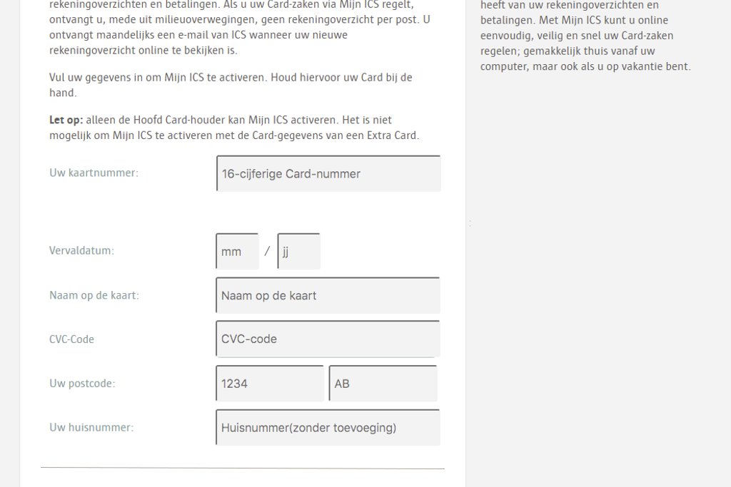 Als je op de link in de mail klikt, kom je uit op een nepsite waar je moet inloggen met je 'Mijn ICS' accountgegevens. Als je dit gedaan hebt, moet je je account activeren. Dit doe je met veel gevoelige informatie. Zo geef je bijvoorbeeld je CVC-code op en moet je je adresgegevens invullen. Als oplichters deze gegevens in handen krijgen, kunnen ze met gemak je creditcard misbruiken en bijvoorbeeld dure aankopen doen op jouw kosten.