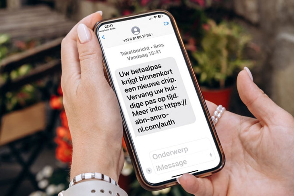 Het iMessage-bericht is afkomstig van het nummer '+31 6 81681758', maar dit is geen officieel nummer van de bank. In het bericht staat dat je je huidige pas op tijd moet vervangen met de nieuwe chip. Door het gebruik van tijdsdruk proberen cybercriminelen je sneller te laten handelen. Laat je niet opjagen door zogenaamde tijdsdruk en vraag niets aan.