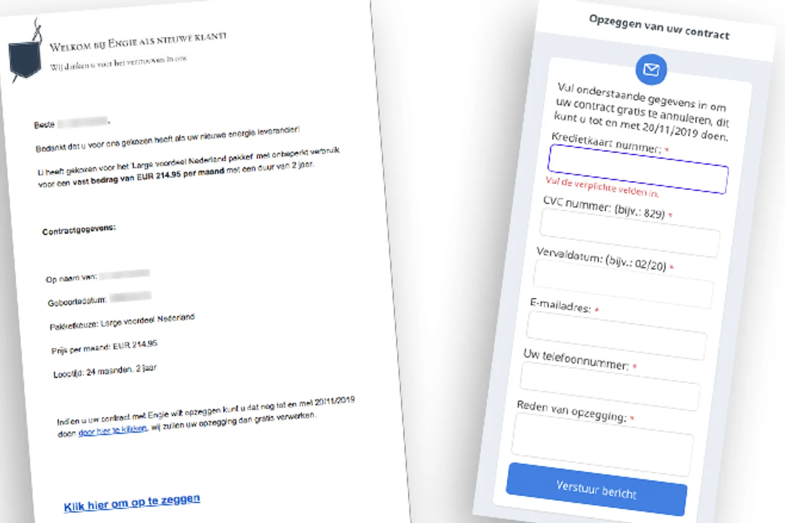 Dit zegt je waarschijnlijk niks, en dat is precies waar de oplichters op inspelen: de mail bevat namelijk ook een dikke vette afmeldlink. Als je daarop klikt kom je op een pagina met een vage url (in elk geval geen officieel ENGIE-domein!) en een formulier waarin je onder andere je creditcardgegevens zou moeten invullen. Doe dit niet! De fraudeurs willen met je betaalgegevens aan de haal gaan.
