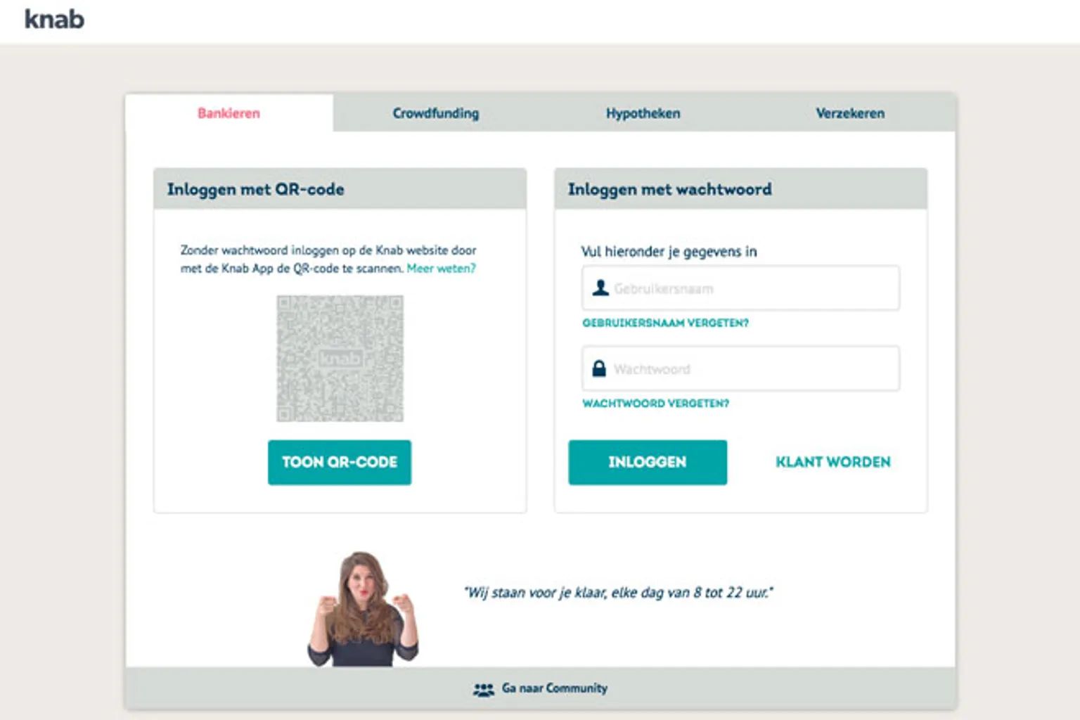 Als je toch op de link geklikt hebt, kom je op een website waarop je moet inloggen met je gebruikersnaam of een QR-code. Vul je gegevens niet in! De website lijkt enorm veel op de website van Knab en heeft zelfs een kopje over veilig inloggen.