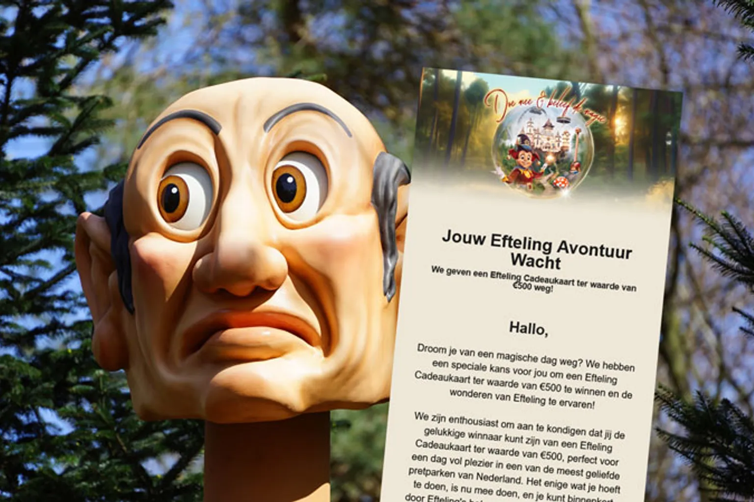 ‘Vul een vragenlijst in en maak kans op een Efteling-cadeaukaart van 500 euro’, mailen oplichters. Laat je niet lekker maken met korting op tickets of andere voordelen, want dit is nep.