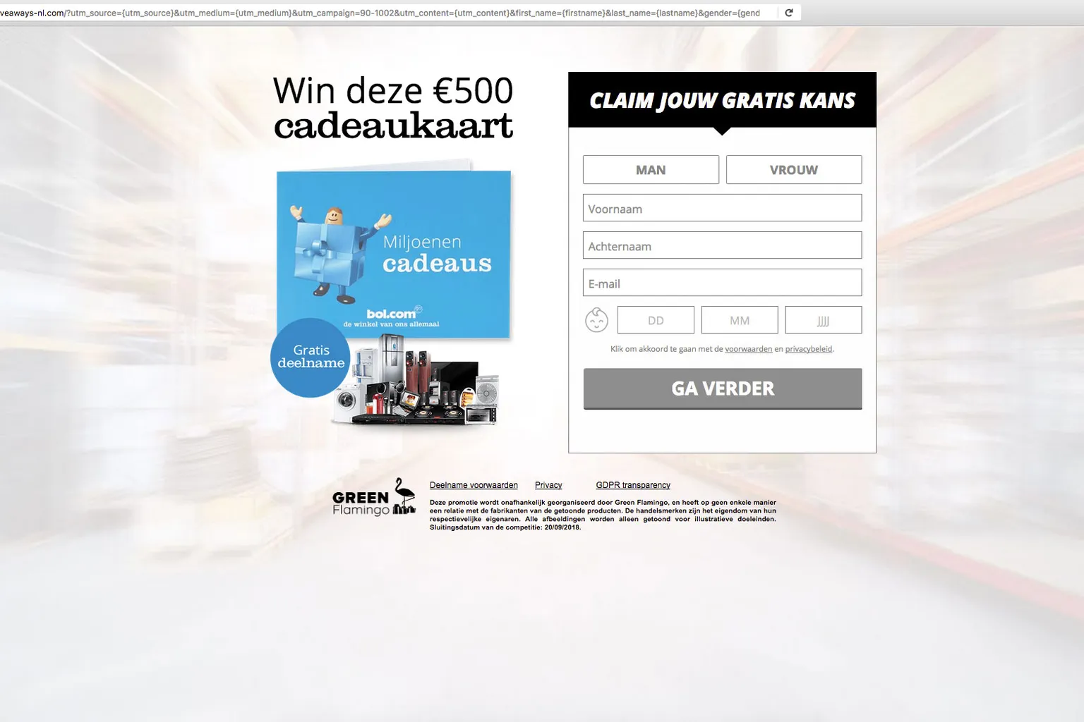 Er wordt in dit formulier naar je gegevens gevraagd. We raden je aan de voorwaarden te lezen voor je je persoonlijke informatie deelt. In de voorwaarden staat namelijk dat de winactie door een Iers marketingbureau is georganiseerd. Dit bureau wil jouw gegevens doorverkopen aan hun sponsoren. Deze sponsoren zullen je op hun beurt lastigvallen met spamberichten en ongewenste telefoontjes. Daarnaast wordt duidelijk dat je geen cadeaukaart voor bol.com kunt winnen.