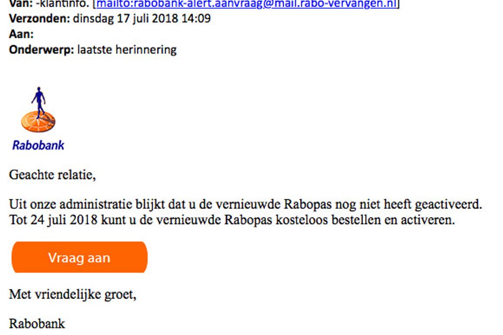 Momenteel is een e-mail in omloop waarin staat dat je de vernieuwde Rabopas nog niet hebt geactiveerd. Tot 24 juli zou je de nieuwe pas zogenaamd gratis kunnen bestellen en activeren via een button in het bericht. Klik hier niet op! Je komt terecht op een valse website waar criminelen naar je gegevens hengelen.