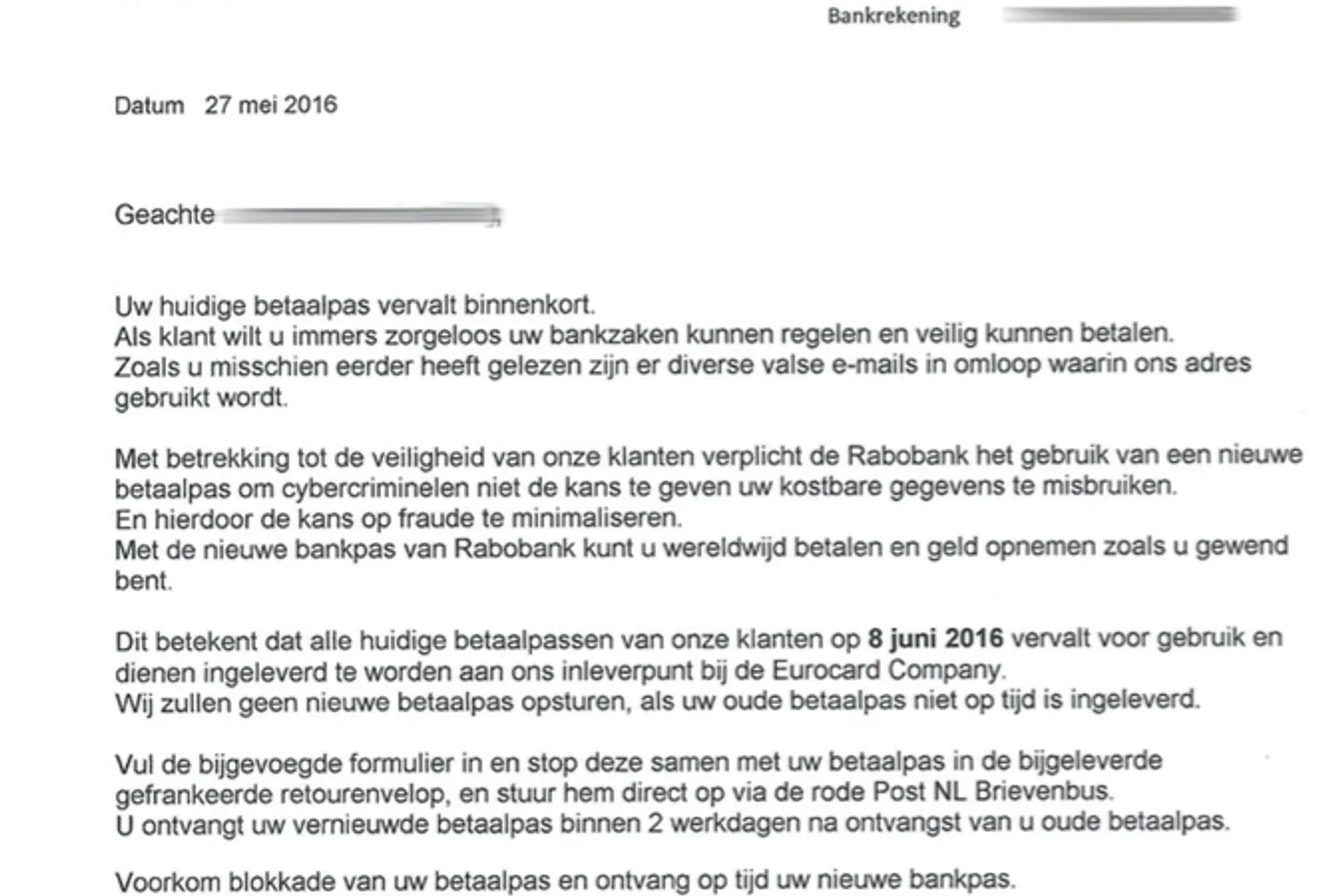 De strekking is hetzelfde: vanwege 'veiligheid' moet je gebruik gaan maken van een nieuwe betaalpas. Alle passen zullen zogenaamd binnenkort vervallen. Je ontvangt je bankpas pas, als je de oude hebt opgestuurd. Daarnaast staat er in de brief dat je je huidige pincode te lang in gebruik hebt. Daarom wordt er geadviseerd om ook deze te wijzigen en mee te sturen samen je pinpas. Bij de brief zit zelfs en enveloppe waarin je alles gemakkelijk kunt opsturen.