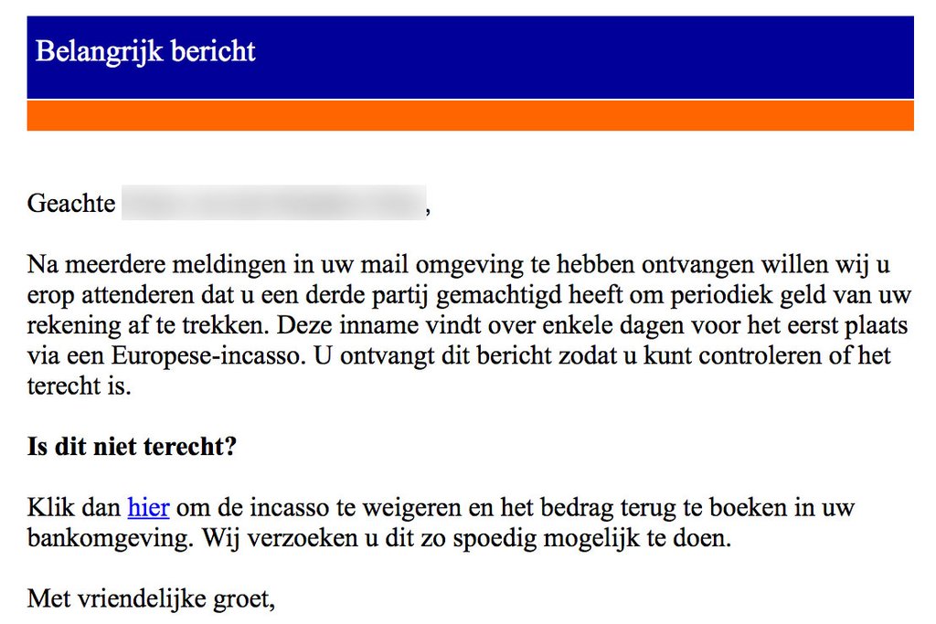 Volgens het bericht heb je een derde partij gemachtigd om periodiek geld van je rekening af te schrijven. De eerste incasso vindt zogenaamd over enkele dagen plaats. Je hebt de e-mail ontvangen om te controleren of de geplande afschrijving terecht is.